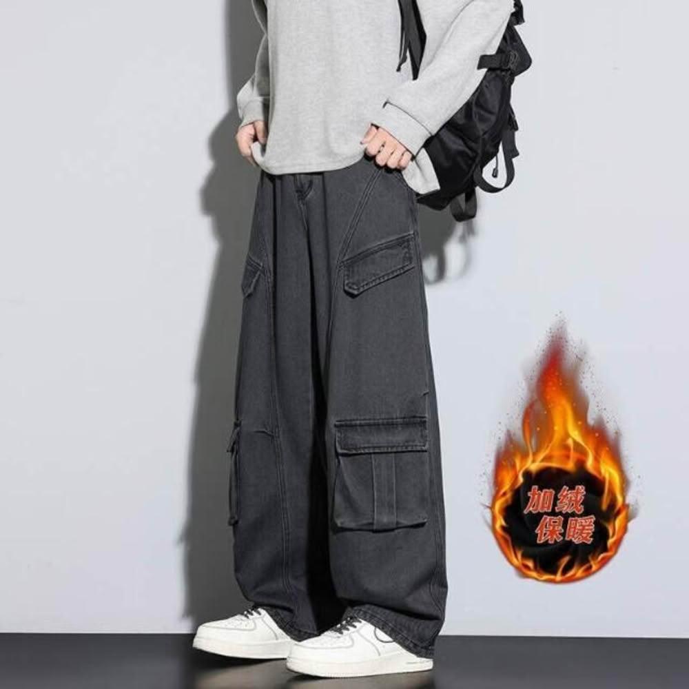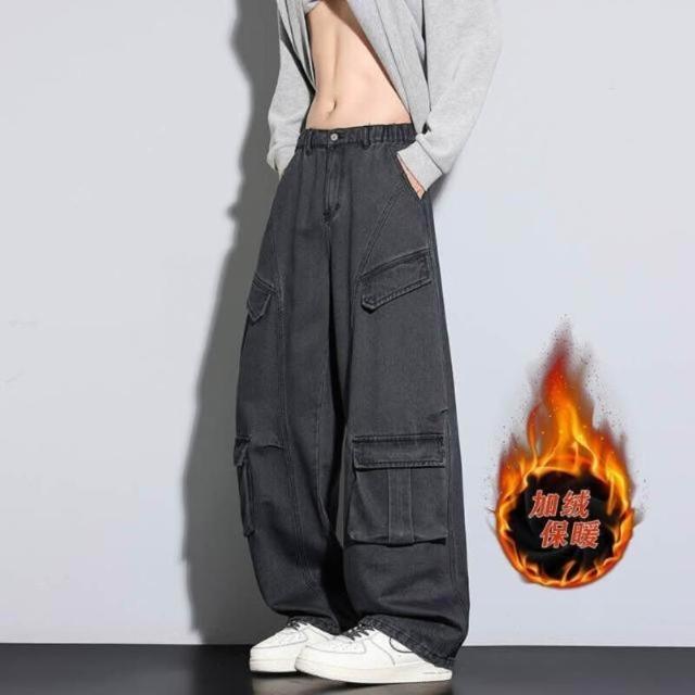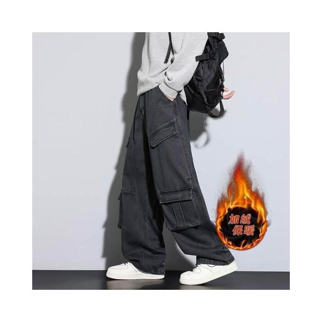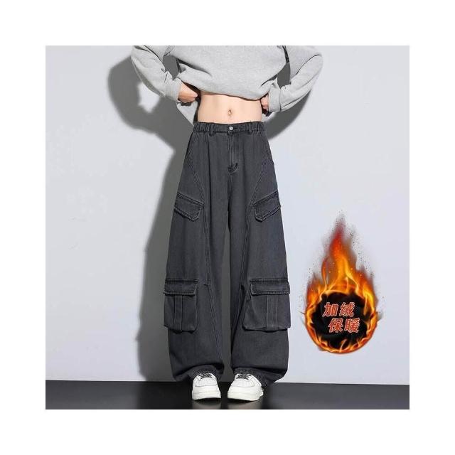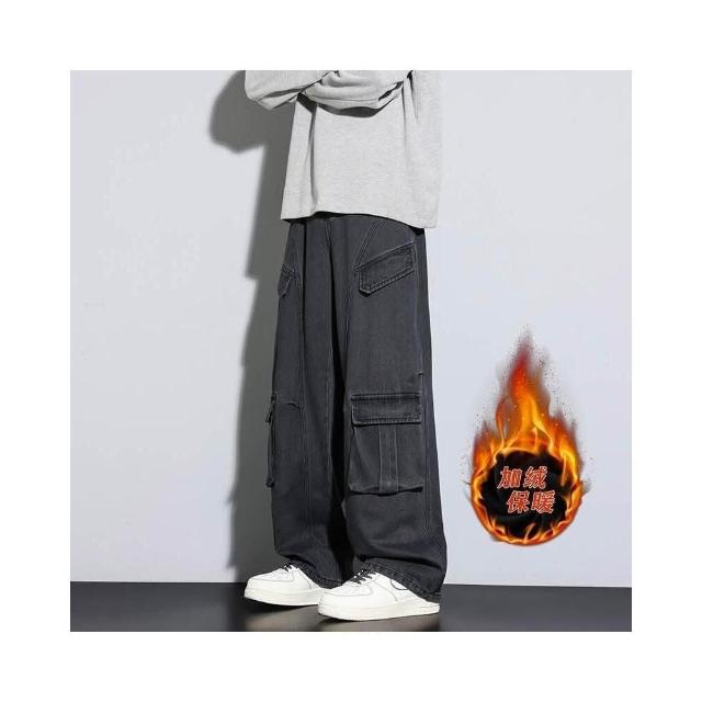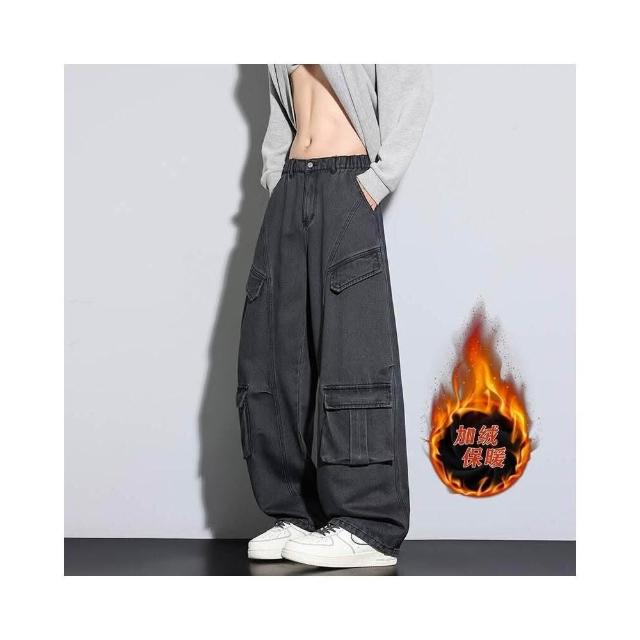 牛仔褲男女同款堆堆秋冬內磨毛闊腿長褲通勤加絨刷毛厚磅保暖寬褲高腰直筒寬鬆耐磨工作做舊垂感休閒拖地彎刀水洗加厚工裝褲男牛仔