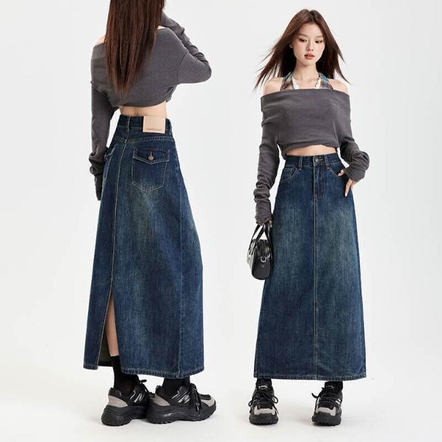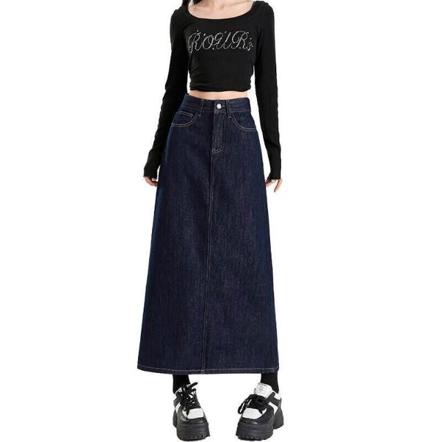 裙子半身裙長裙丹寧藍高腰開叉牛仔半身裙女春秋中長款顯瘦包臀裙子辣妹通勤牛仔長裙女韓版顯瘦直筒高腰開叉復古百搭遮肉日常長裙