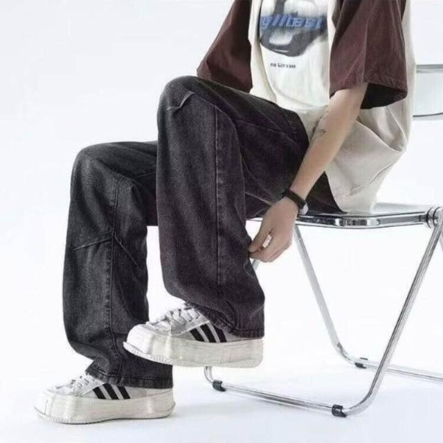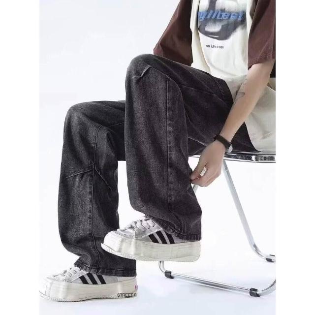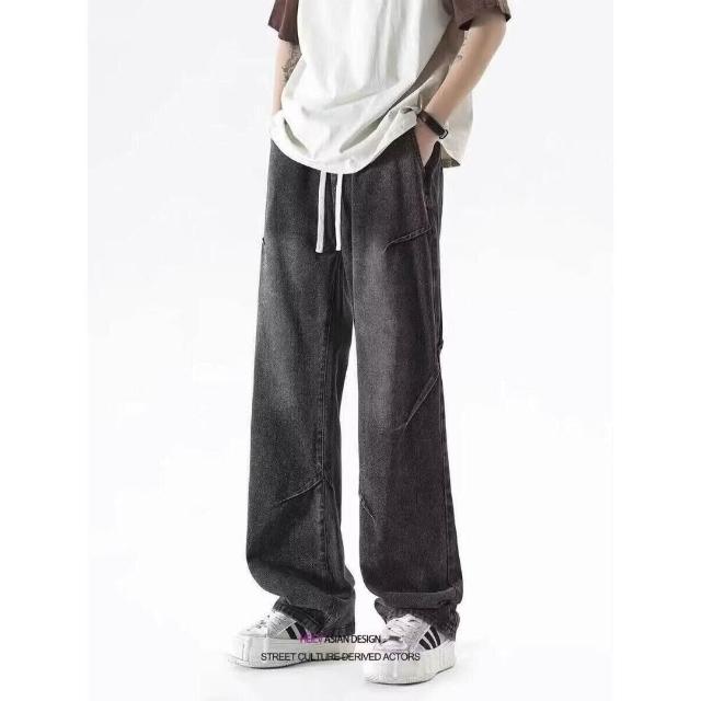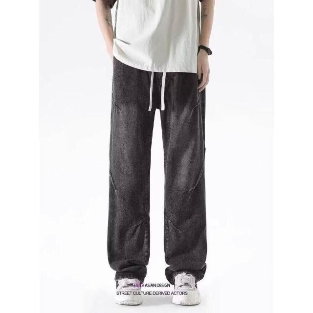 彎刀褲牛仔褲 牛仔褲復古做舊黑灰色寬松男直筒闊腿抽繩松緊腰休閑長褲大尺碼直筒休閒褲耐磨登山褲冬季機能薄款垂感韓版闊腿褲運動褲工裝褲低腰