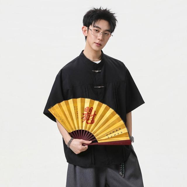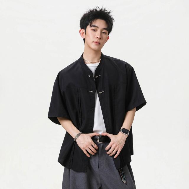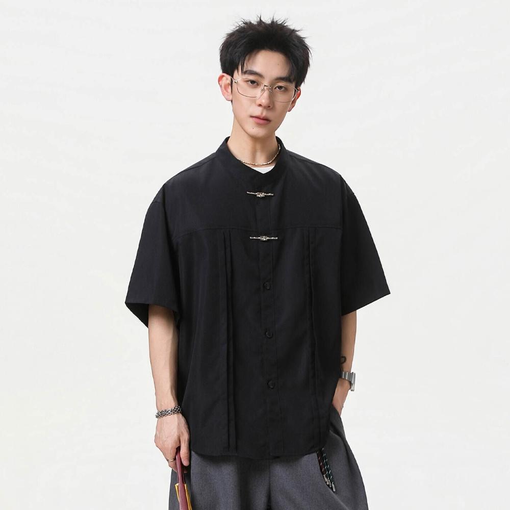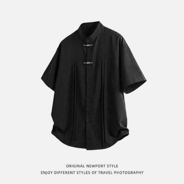 襯衫涼感衣短袖T恤男韓版寬鬆純棉透氣涼感夏季休閒百搭圓領上衣國風短袖襯衫男裝夏季質感垂順盤扣唐裝立體壓褶高級感襯衣情侶上衣男女同款吸濕排汗親膚