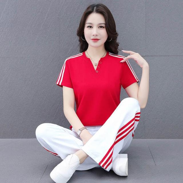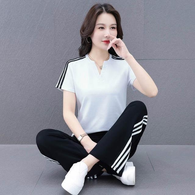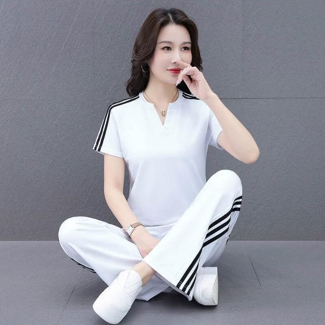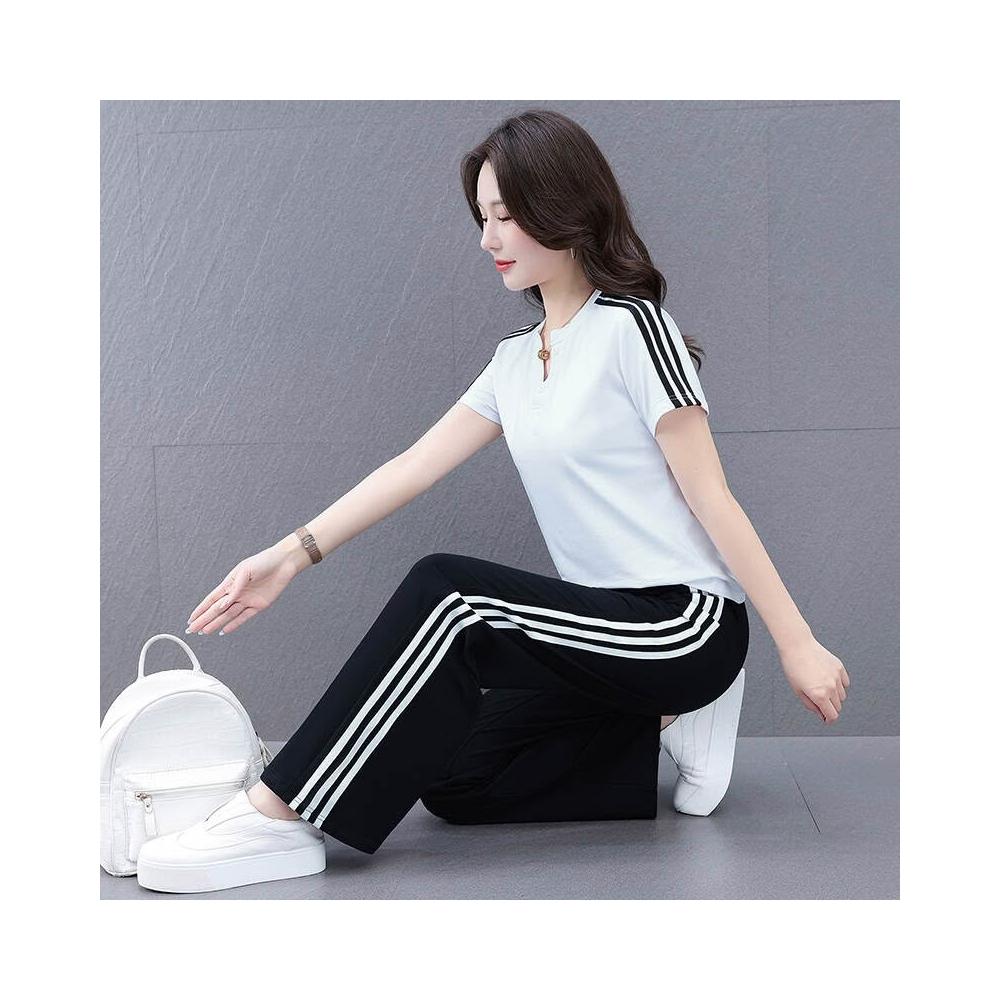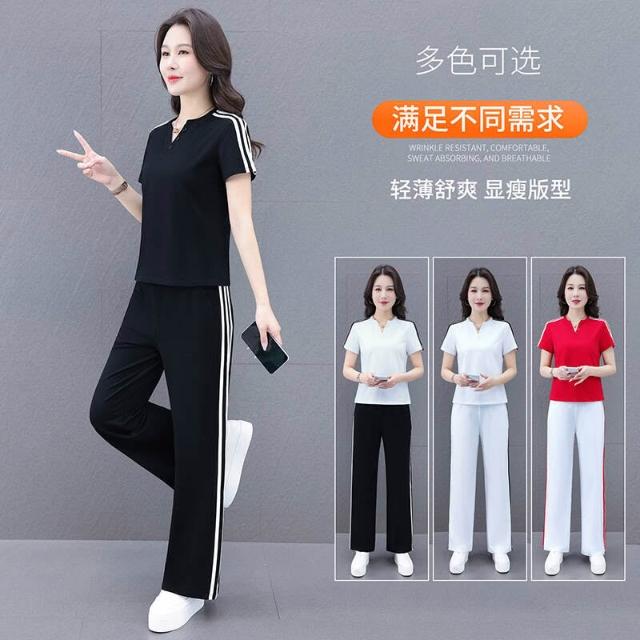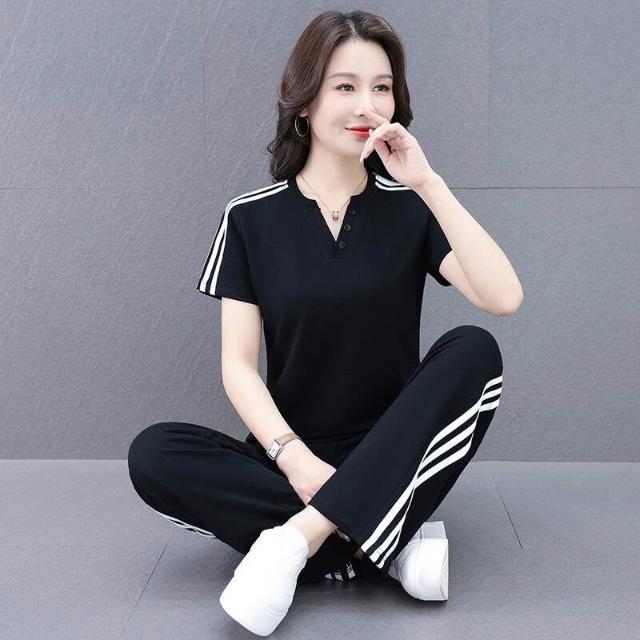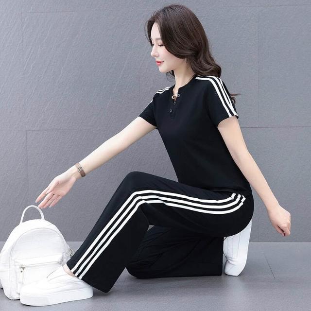涼感衣冰絲衣套裝運動套裝女冰絲涼感速乾短袖長褲兩件式夏季顯瘦休閒套裝冰絲V領套裝條紋三條杠百搭修身顯瘦闊腿褲兩件套高爾夫球衫透氣不粘身寬鬆束腳吸濕排汗速乾大尺碼
