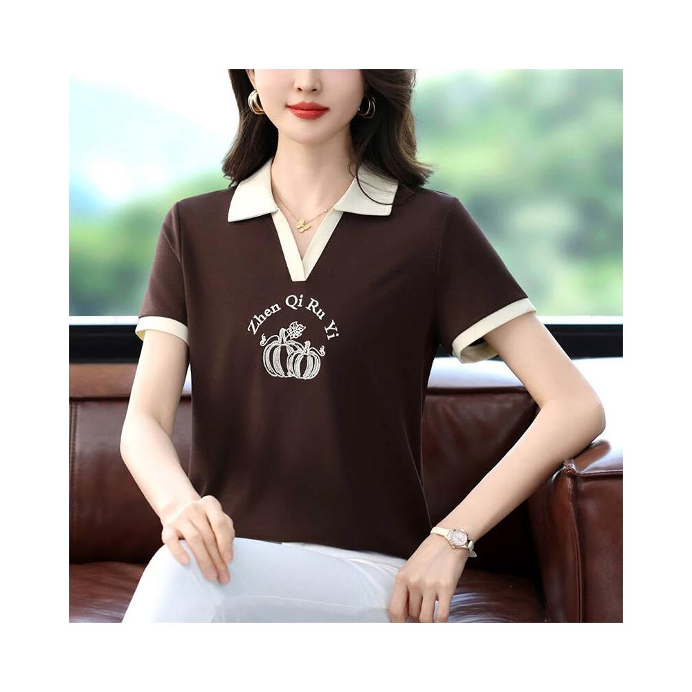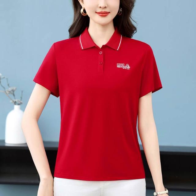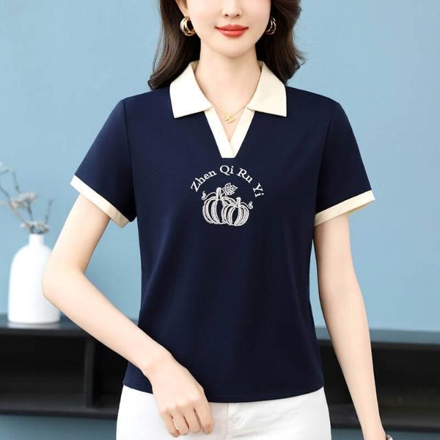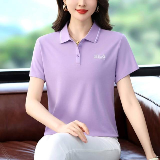 POLO衫冰絲T恤女薄款涼感速乾寬鬆落肩通勤簡約簡約素面柔軟抗皺不變形親膚透氣高品質時尚繡標燙鉆冰絲高雅新款洋氣Polo短袖夏款時尚顯瘦打底Polo衫