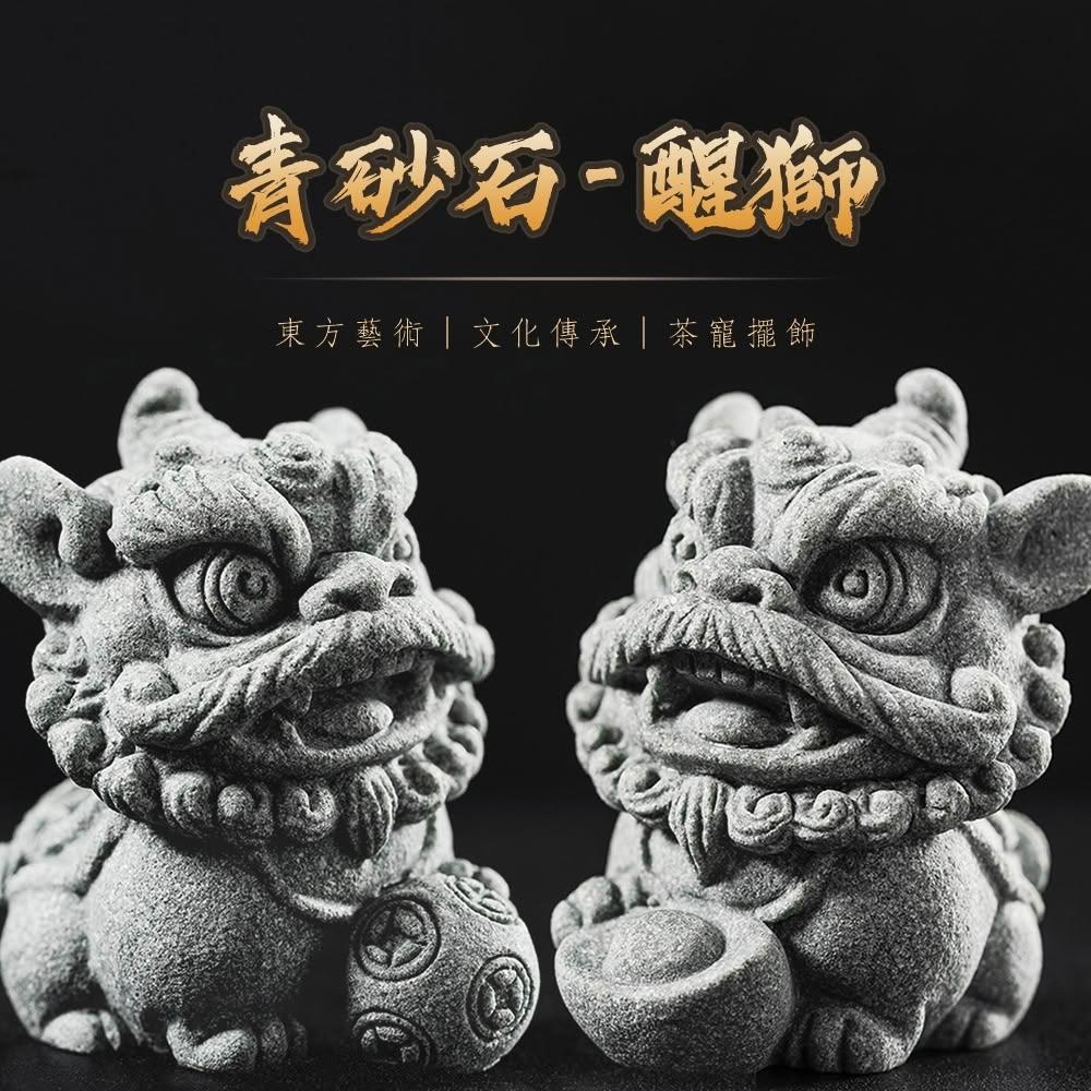 開運招財醒獅擺飾 青砂石石獅組(贈底座)
