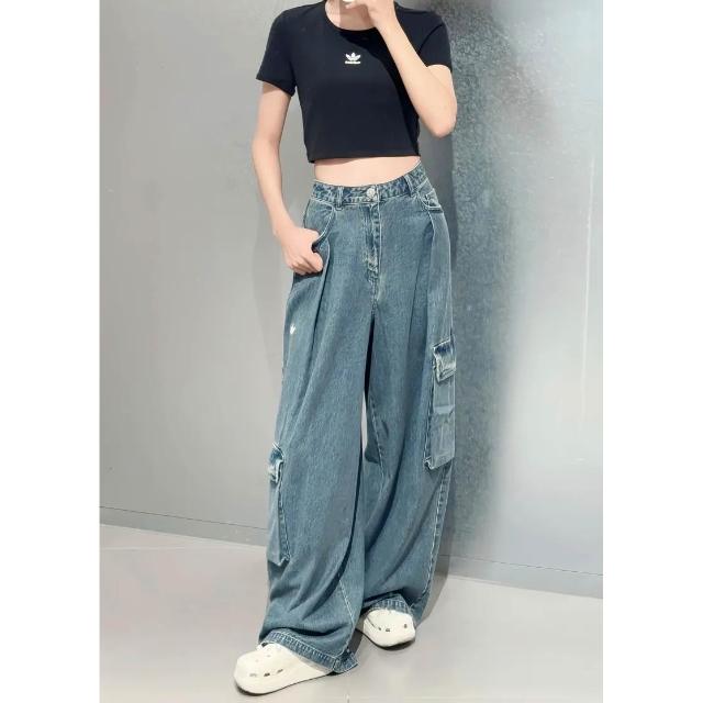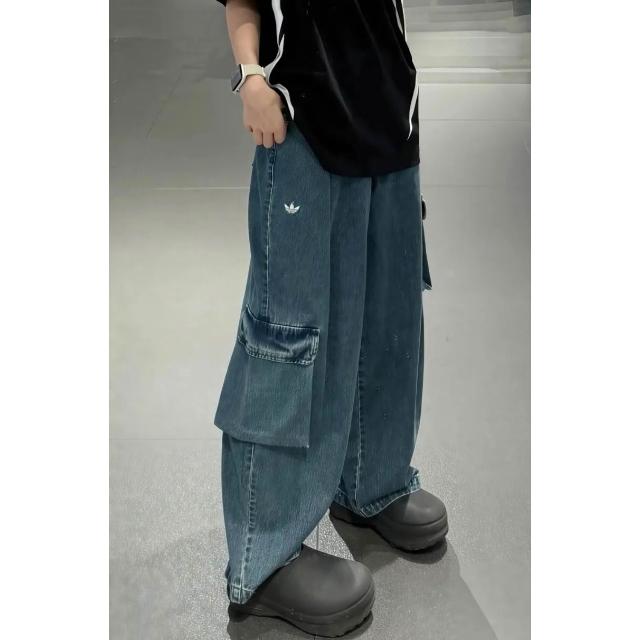 adidas 愛迪達[Siou's]DENIM CARGO 軟單寧 刷舊藍 不對稱口袋 工裝牛仔褲 彎刀褲-KC5813