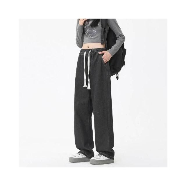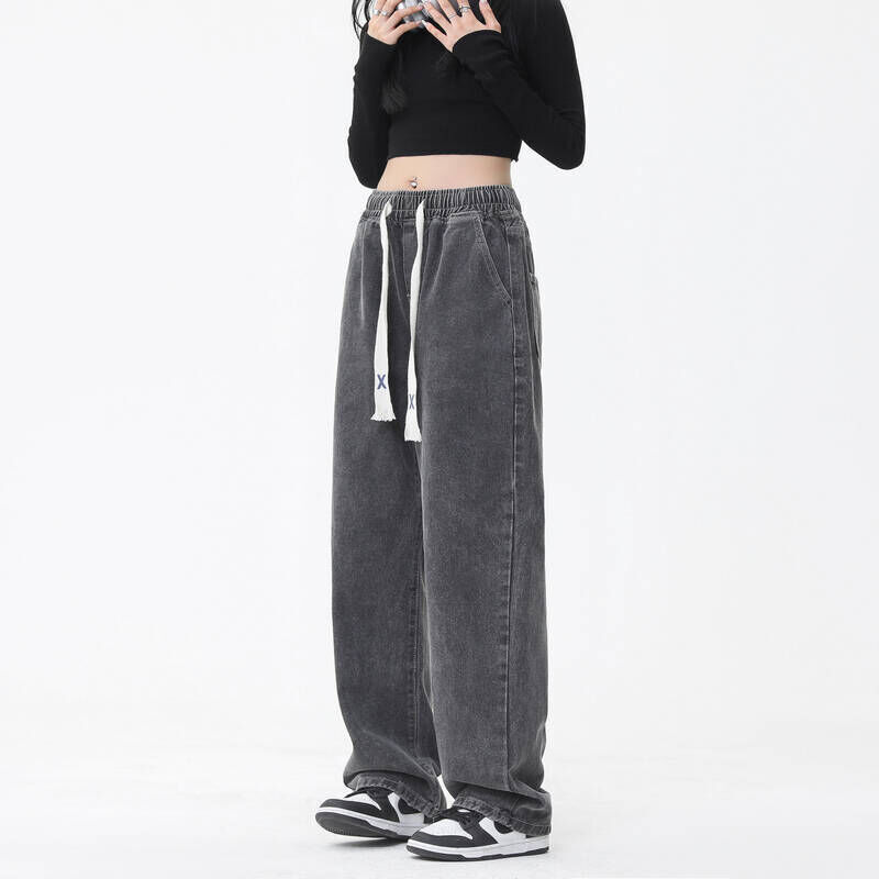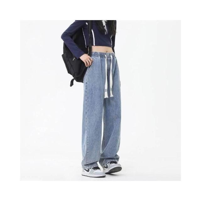 直筒牛仔褲女四季可穿大尺碼高腰闊腿水洗牛仔褲情侶韓版潮流百搭牛仔長褲寬松透氣耐磨美式復古輪廓彎刀褲鬆緊腰高街垂感顯瘦褲子