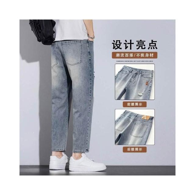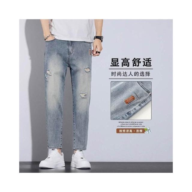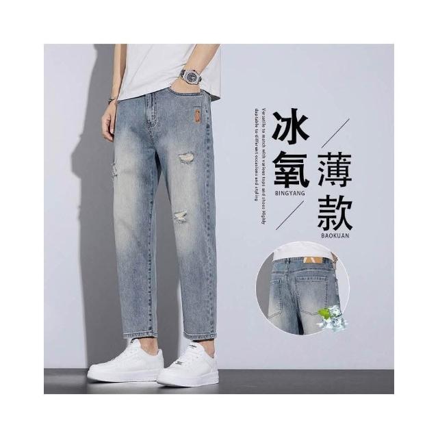 牛仔褲破洞男士夏季薄款透氣百搭小直筒牛仔九分褲男美式復古寬松直筒冰感九分休閑褲美式柔軟舒適爸爸保暖工作褲彈性防風運動長褲