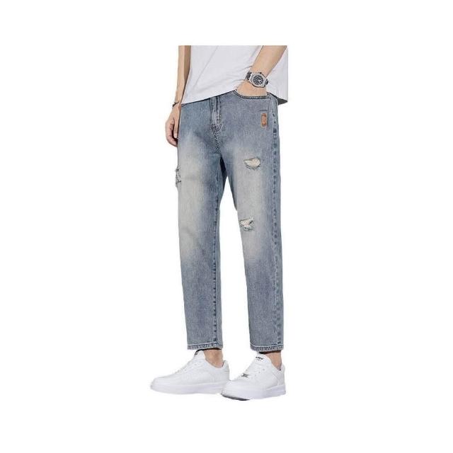 牛仔褲破洞男士夏季薄款透氣百搭小直筒牛仔九分褲男美式復古寬松直筒冰感九分休閑褲美式柔軟舒適爸爸保暖工作褲彈性防風運動長褲