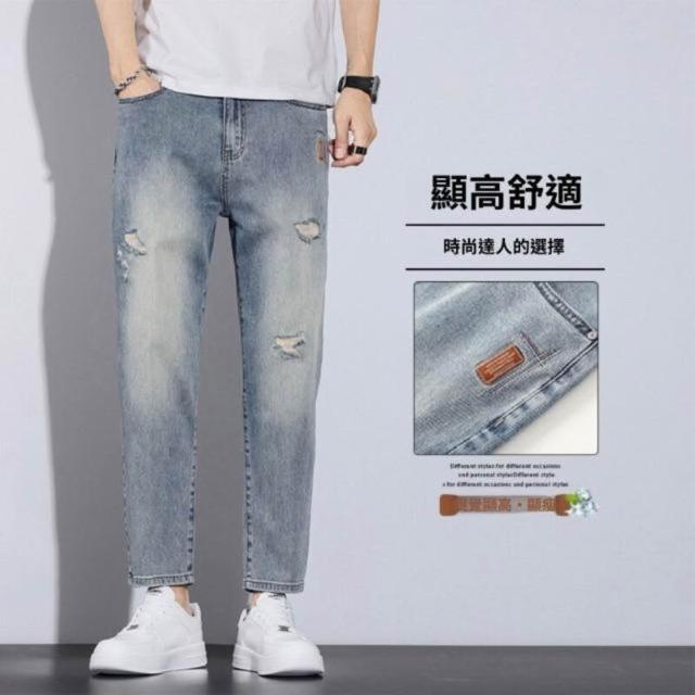 牛仔褲破洞男士夏季薄款透氣百搭小直筒牛仔九分褲男美式復古寬松直筒冰感九分休閑褲美式柔軟舒適爸爸保暖工作褲彈性防風運動長褲