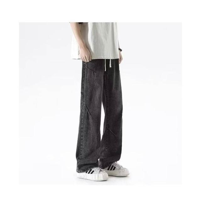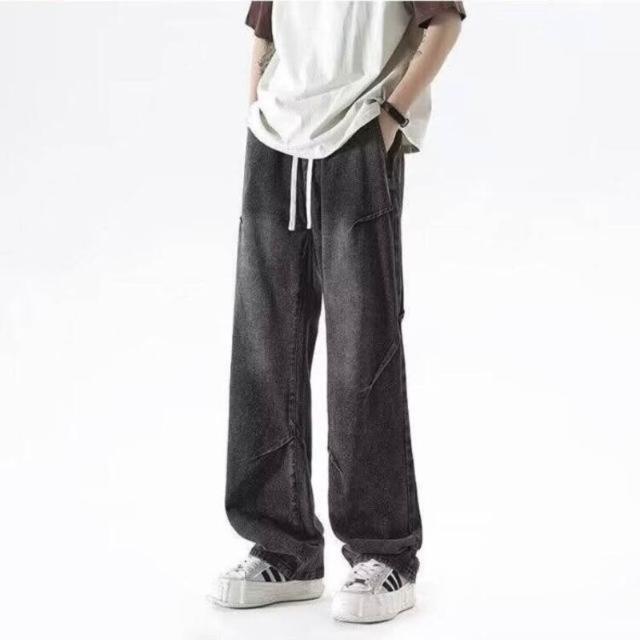 牛仔褲復古做舊黑灰色寬松男直筒闊腿抽繩松緊腰休閑長褲大尺碼直筒休閒褲耐磨登山褲冬季機能薄款垂感韓版闊腿褲運動褲工裝褲低腰