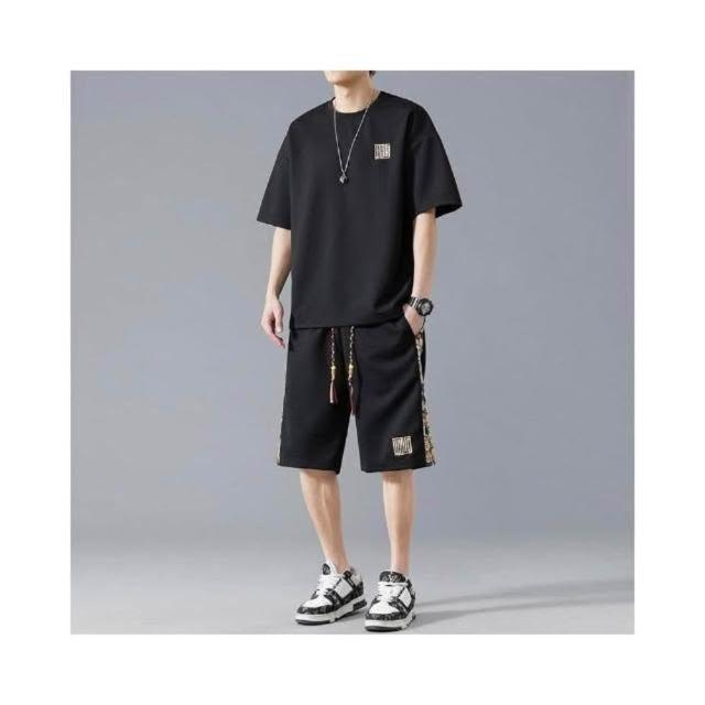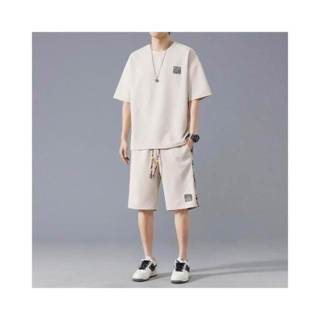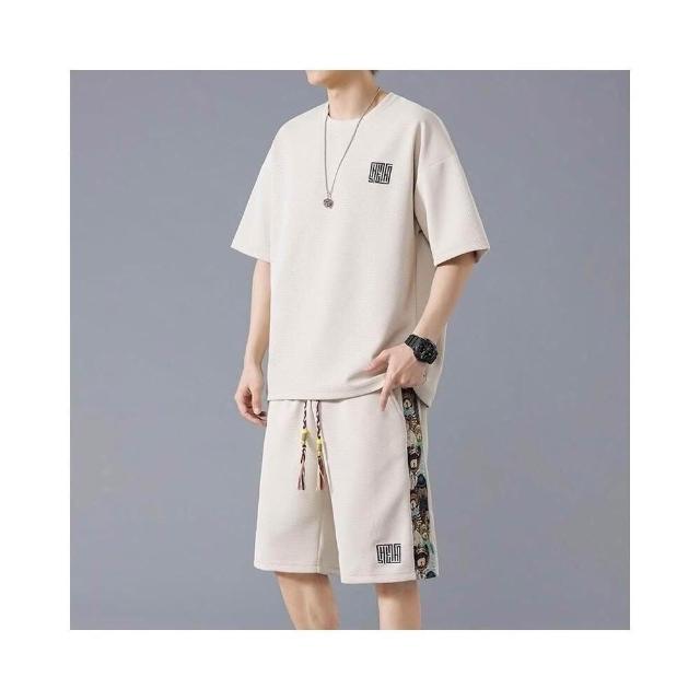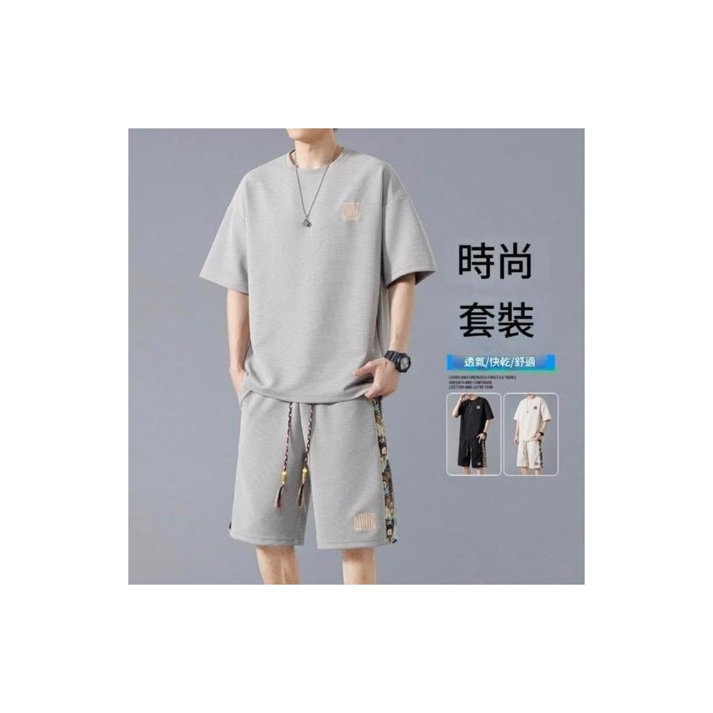 休閒運動套裝男華夫格夏季大碼兩件套黑色運動短褲寬鬆短袖T恤速乾透氣吸濕排汗大學T薄款夏天涼爽日式柔軟舒適五分褲男生帥氣