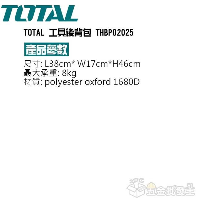 TOTAL 工具後背包 THBP02025 工具袋 工具包 工具背包 耐重20公斤