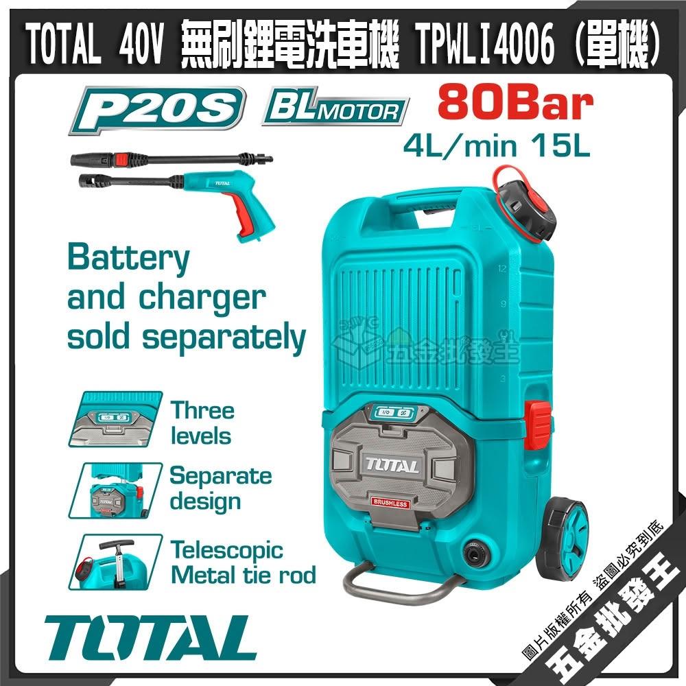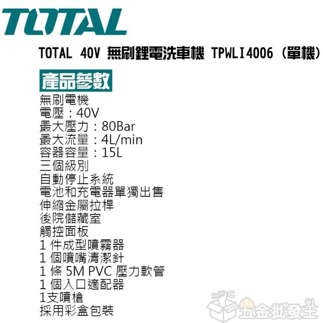 TOTAL 40V 無刷鋰電洗車機 TPWLI4006 (單機) 高壓清洗機 充電洗車機