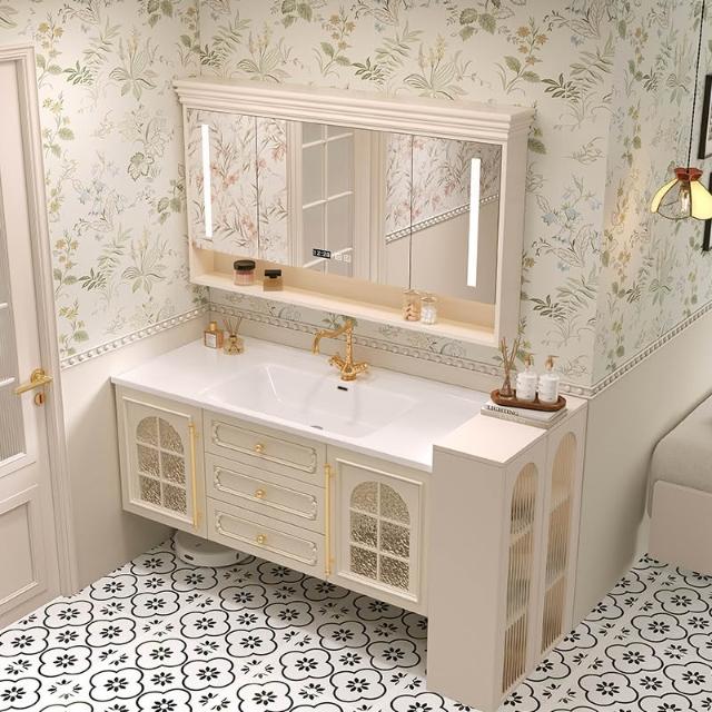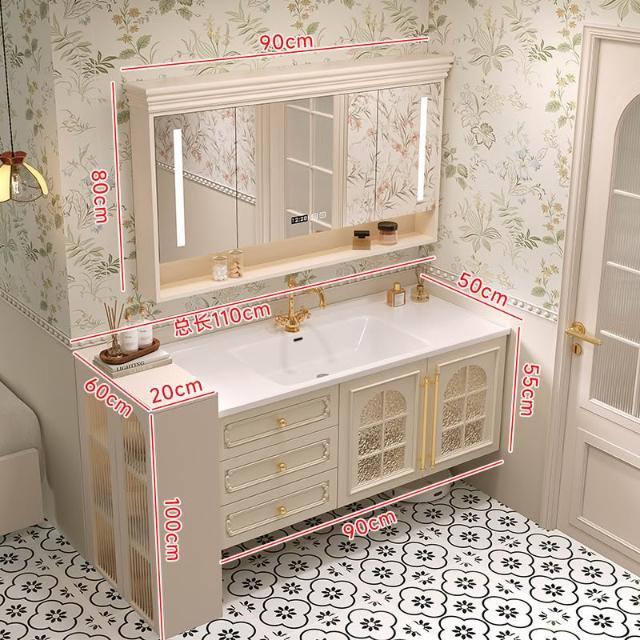 免運 落地浴室櫃組合 法式輕奢風實木浴室櫃 隔斷側櫃組合 法式簡約風浴室儲物櫃 陶瓷一體盆 洗手洗漱台盆櫃定製