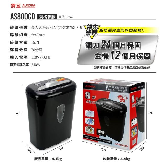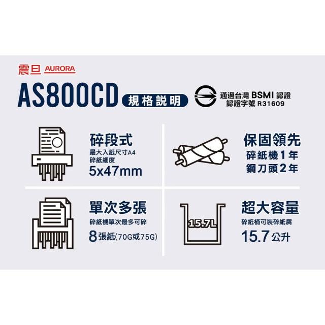 AURORA 震旦AURORA震旦 AS800CD 8張 碎段式 碎斷式 多功能 碎紙機15.7公升 可碎CD信用卡