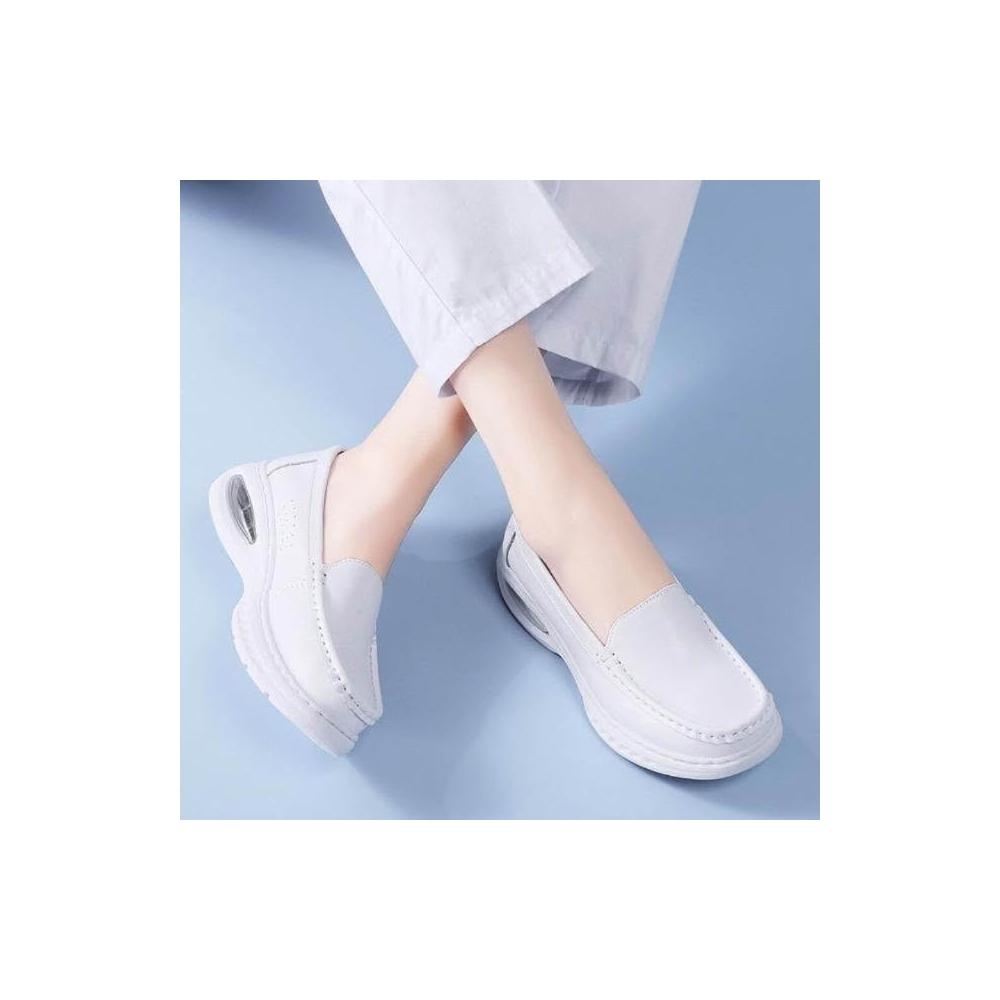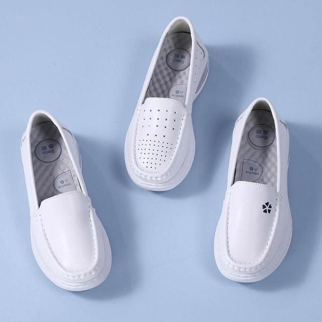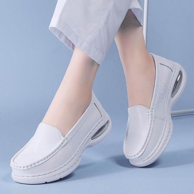 大尺碼護士鞋女帆布鞋軟底透氣久站不累腳白色醫護鞋舒適防滑平底鞋一腳蹬小白鞋耐磨氣墊鞋真牛皮運動休閒鞋內置大氣墊縫製鞋坡跟