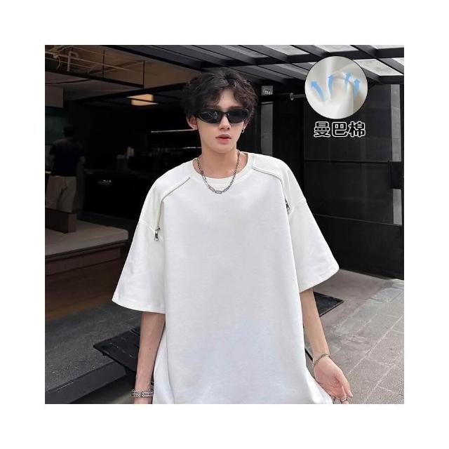 t恤男2025新款夏季雙拉鏈曼巴棉大尺碼重磅休閑透氣圓領上衣寬鬆短袖夏季男生素色潮流寬鬆短T時尚百搭簡約青春流行男裝上衣
