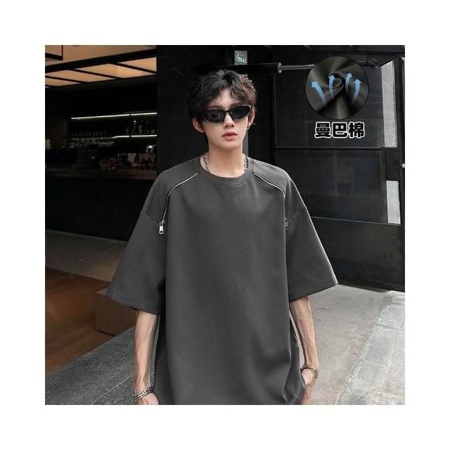 t恤男2025新款夏季雙拉鏈曼巴棉大尺碼重磅休閑透氣圓領上衣寬鬆短袖夏季男生素色潮流寬鬆短T時尚百搭簡約青春流行男裝上衣