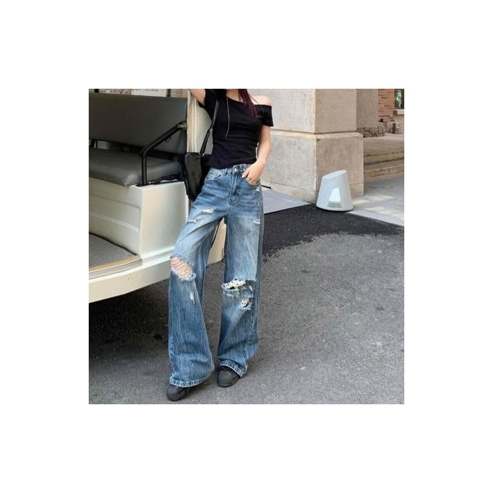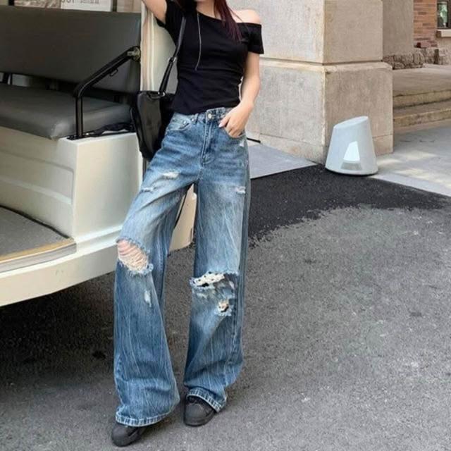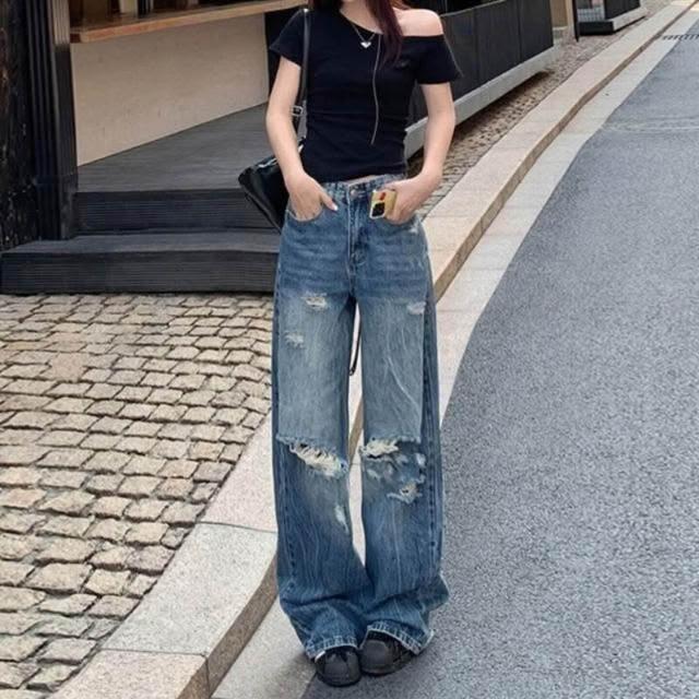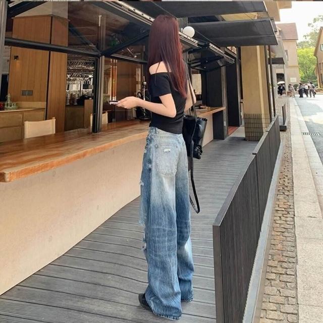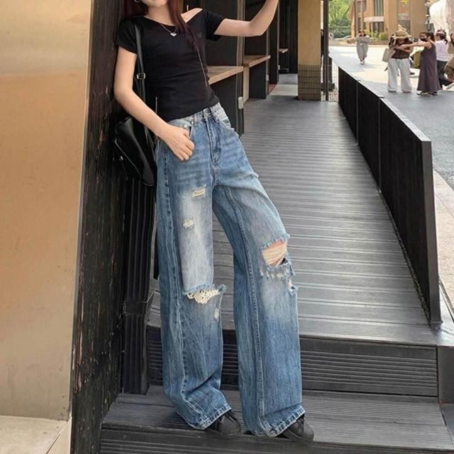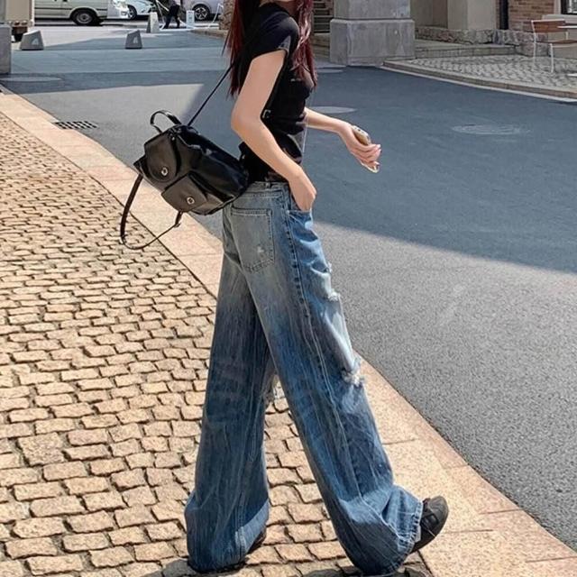 牛仔褲痞帥百搭闊腿男女同款高級感水洗藍街潮破洞款設計男式寬松微喇牛仔褲女高腰牛仔長褲彎刀褲女顯瘦微喇牛仔褲直筒牛仔褲寬鬆