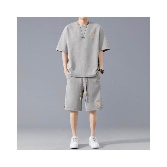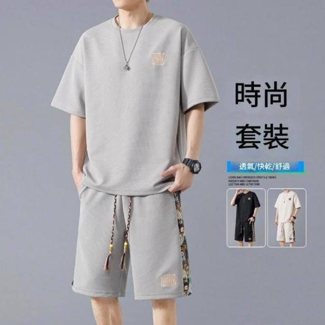 休閒運動套裝男華夫格夏季大碼兩件套黑色運動短褲寬鬆短袖T恤速乾透氣吸濕排汗大學T薄款夏天涼爽日式柔軟舒適五分褲男生帥氣