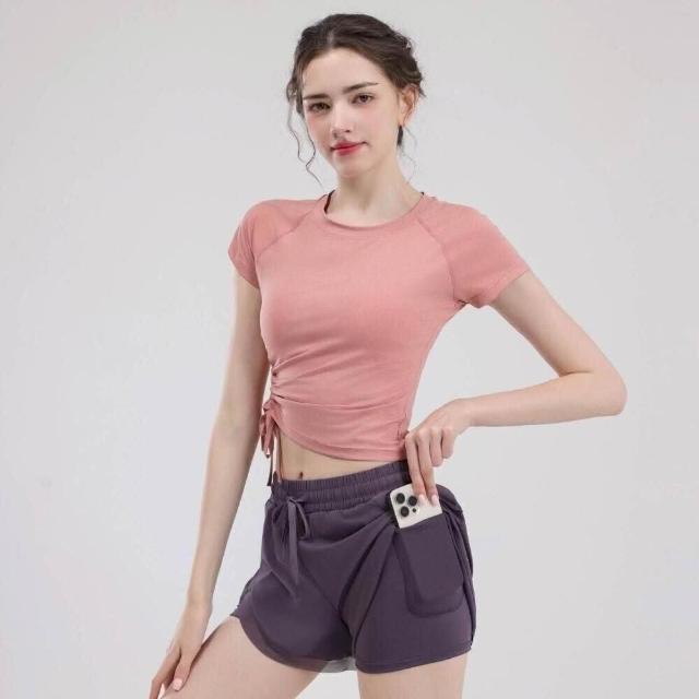 涼感衣女短袖T恤女上衣瑜伽服運動健身服空調服速乾衣冰絲衣運動套裝新款瑜伽服女抽繩緊身運動短袖跑步兩件套健身速幹短褲