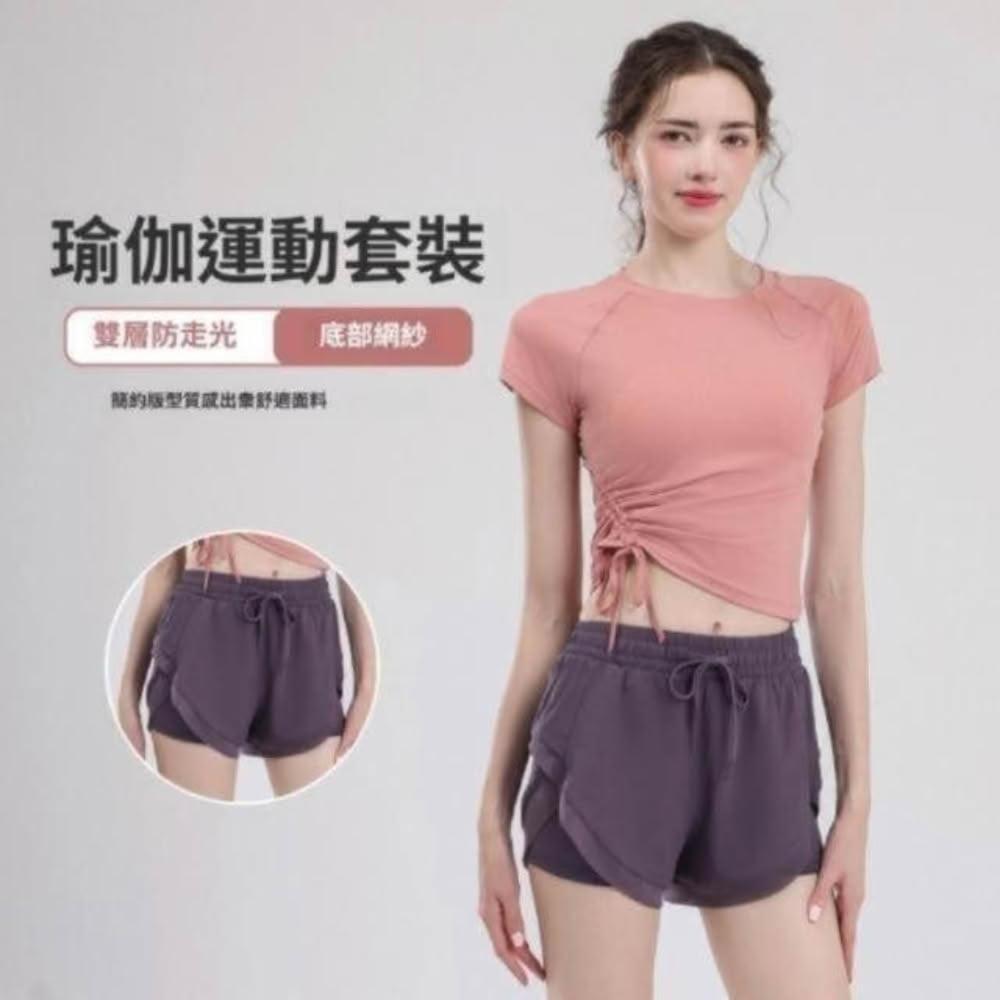 涼感衣女短袖T恤女上衣瑜伽服運動健身服空調服速乾衣冰絲衣運動套裝新款瑜伽服女抽繩緊身運動短袖跑步兩件套健身速幹短褲