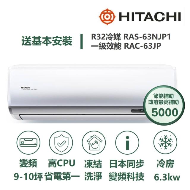 HITACHI 日立【家電速配】區域限定頂級 9-10坪 壓縮機日本製造一級變頻分離式冷氣RAS-63NJP1/RAC-63JP