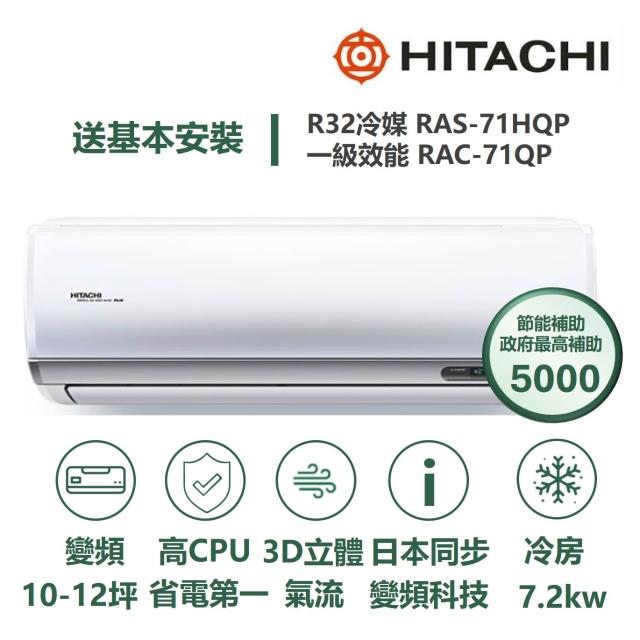 HITACHI 日立【家電速達】區域限定旗艦系列 10-12坪 壓縮機日本製造一級變頻分離式智慧冷氣RAS-71HQP/RAC-71QP