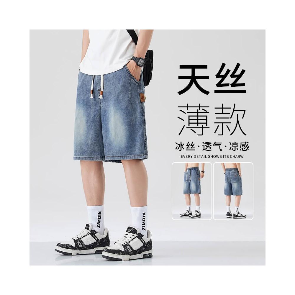 牛仔褲男美式彈力五分牛仔短褲男生夏季時尚潮流涼感超薄透氣直筒天絲牛仔短褲寬鬆五分短褲柔軟舒適鬆緊工作褲戶外通勤休閒下著