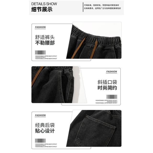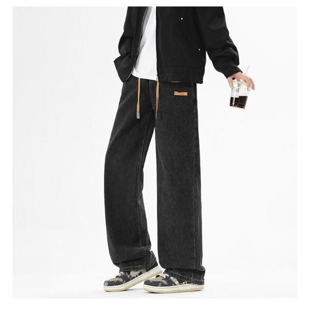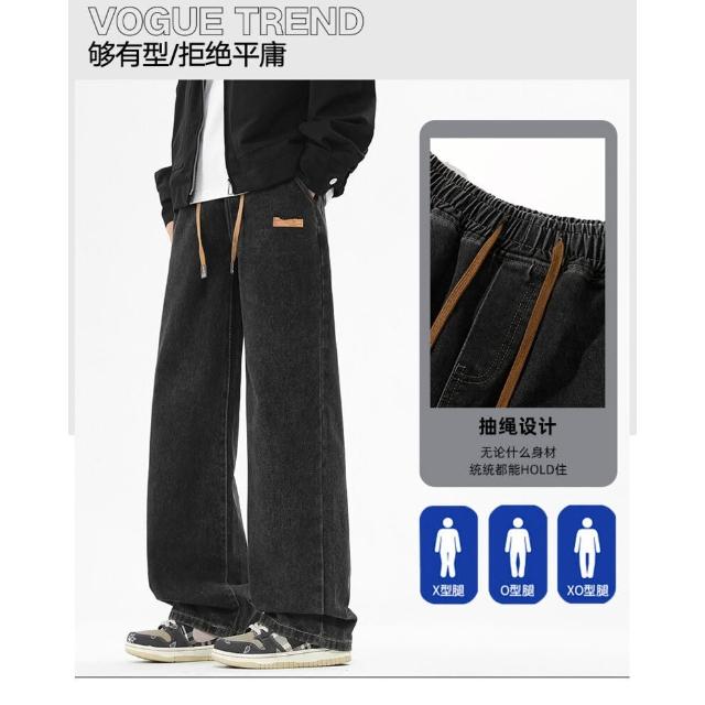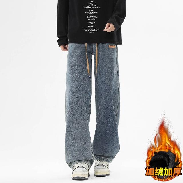 美式復古休閒牛仔褲男士百搭日常通勤抽繩牛仔長褲秋冬加絨加厚保暖寬鬆垂感鬆緊褲頭闊腿長褲青年防刮耐磨男款顯高牛仔褲子