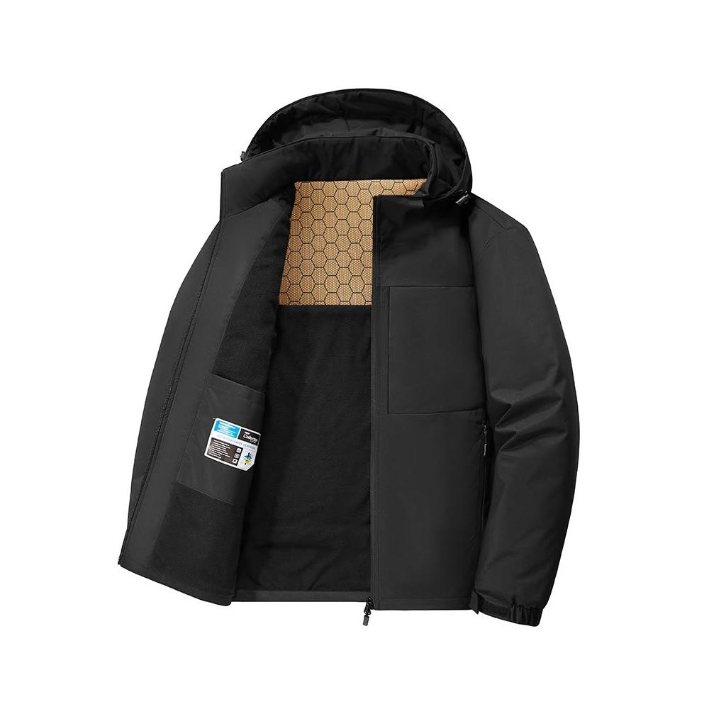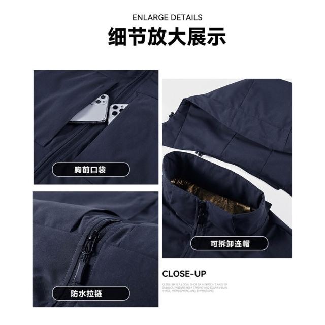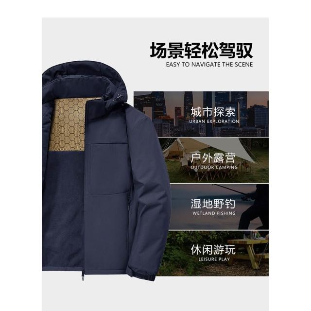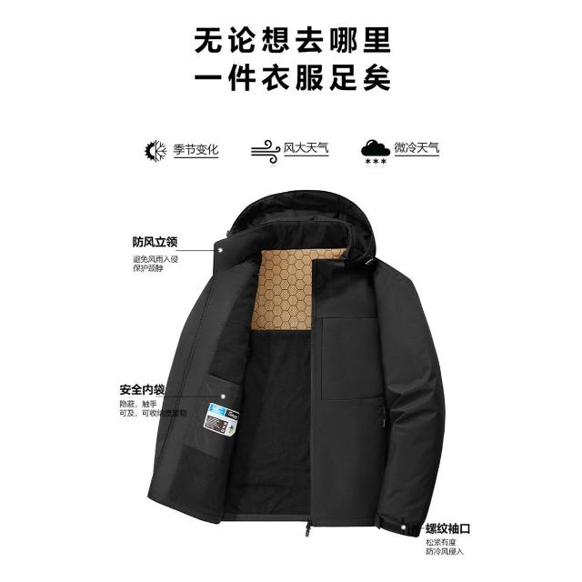 冬季輕商務休閒夾克防風立領外套戶外防潑水可拆卸連帽徒步登山保暖外套石墨烯黑金爸爸裝加絨加厚多口袋工作外套時尚百搭厚外套