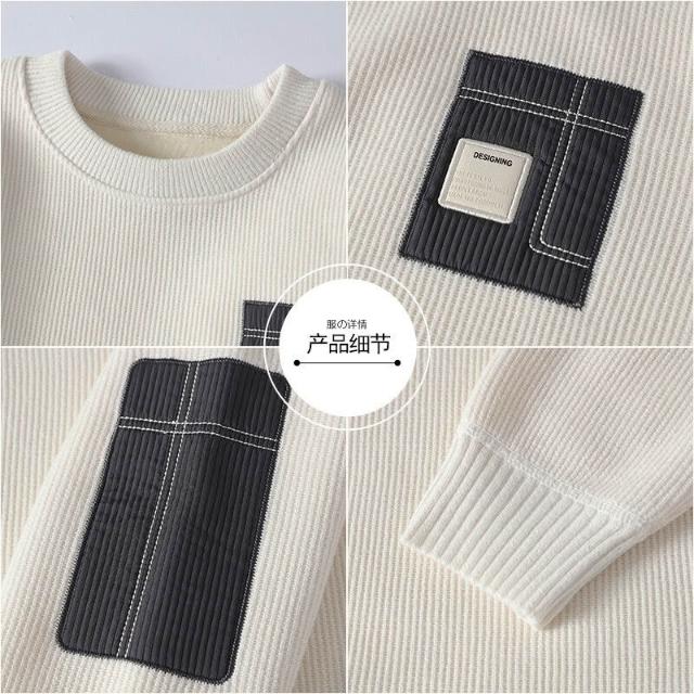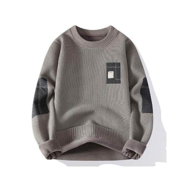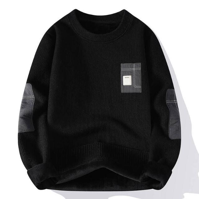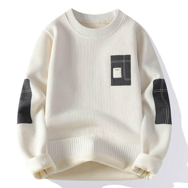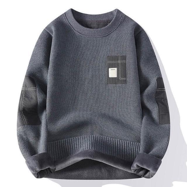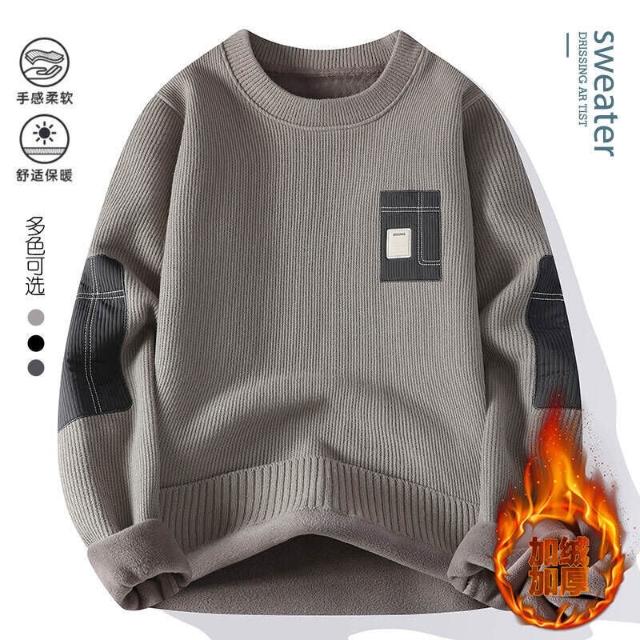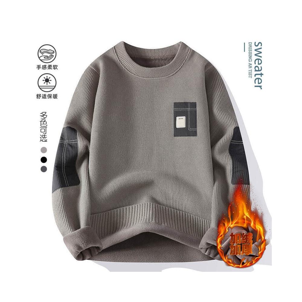 秋冬潮流時尚貼布一體絨毛衣青少年休閒簡約保暖上衣加絨加厚百搭圓領套頭學院風長袖毛衣衫男韓版百搭寬鬆外穿針織打底衫舒適毛衣