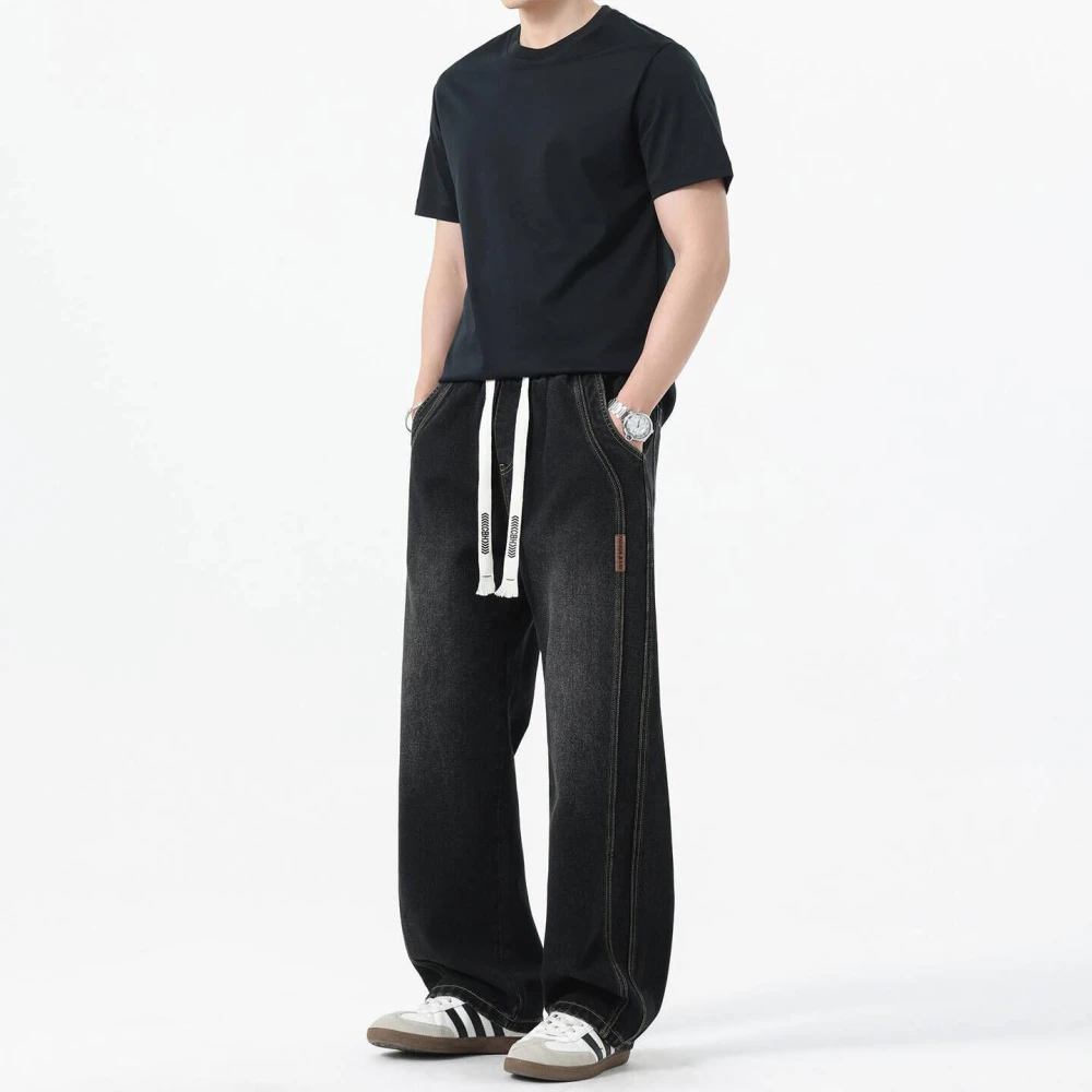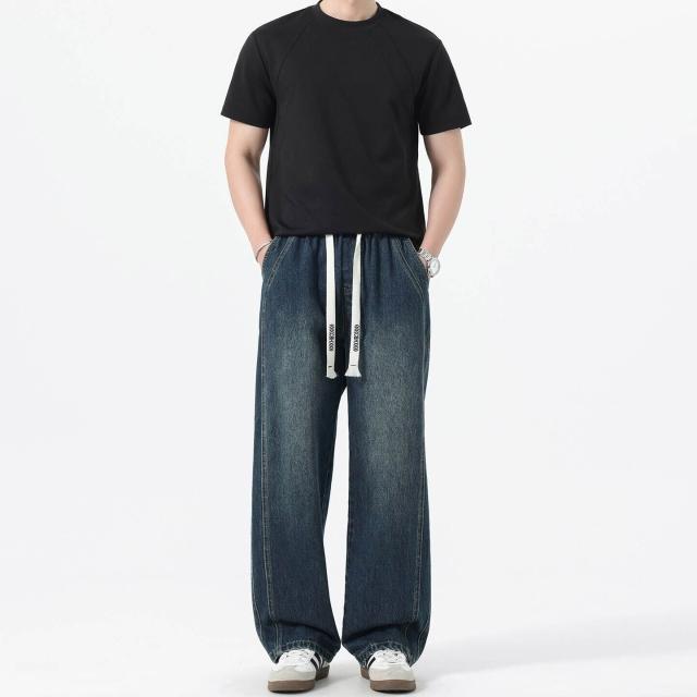 復古牛仔褲男款大尺碼彎刀鬼洗牛仔長褲男生寬鬆休閒褲防風保暖褲彈力寬褲子工作運動長褲鬆緊帶彈性長褲美式高腰闊腿涼感牛仔褲