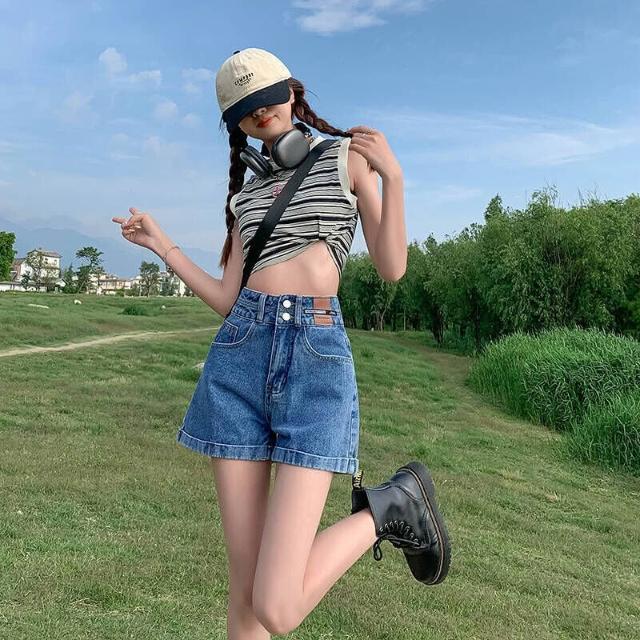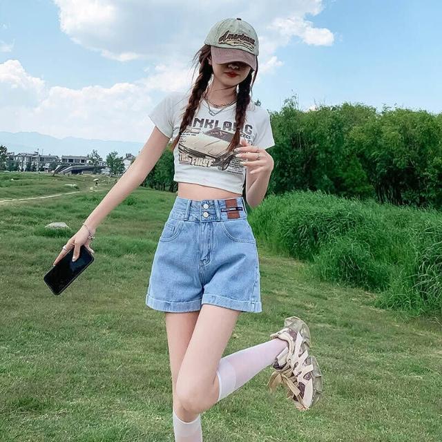 短褲休閒褲牛仔褲刺繡牛仔短褲女夏季年高腰顯瘦小個子外穿熱褲百搭牛仔短褲女韓版高腰顯瘦修身彈力通勤日常遮肉小個子短褲