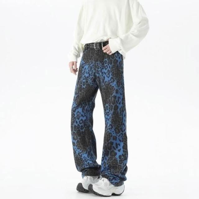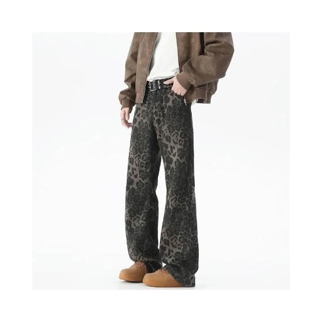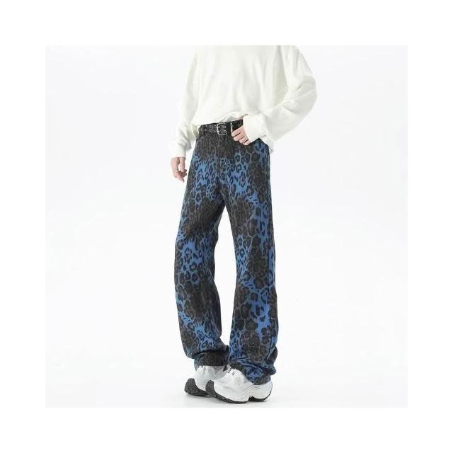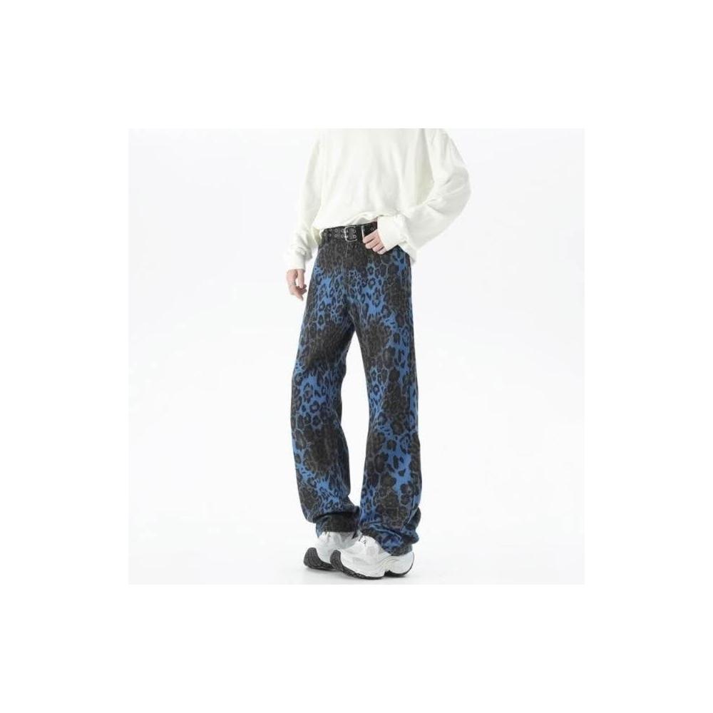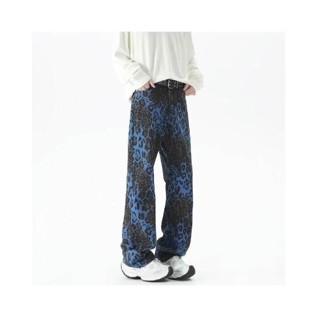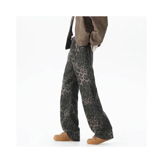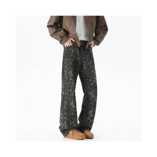 長褲 夏直筒牛仔褲棉花色豹紋 寬版褲腳 復古時尚美式炸街高街 水洗墜感長褲子 丹寧褲寬鬆單寧褲男休閒