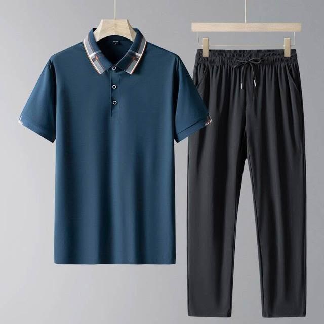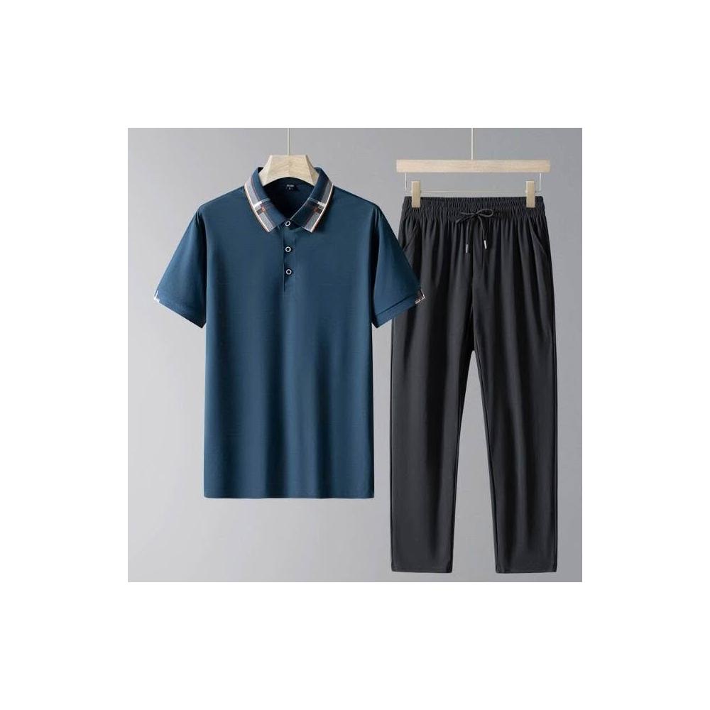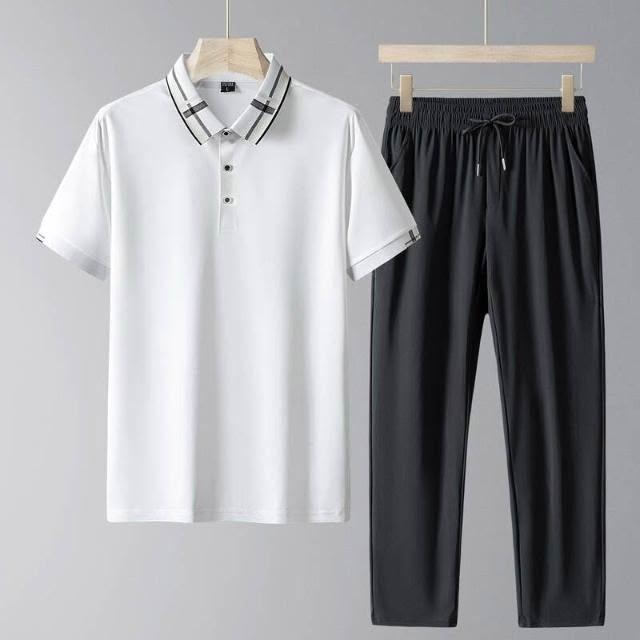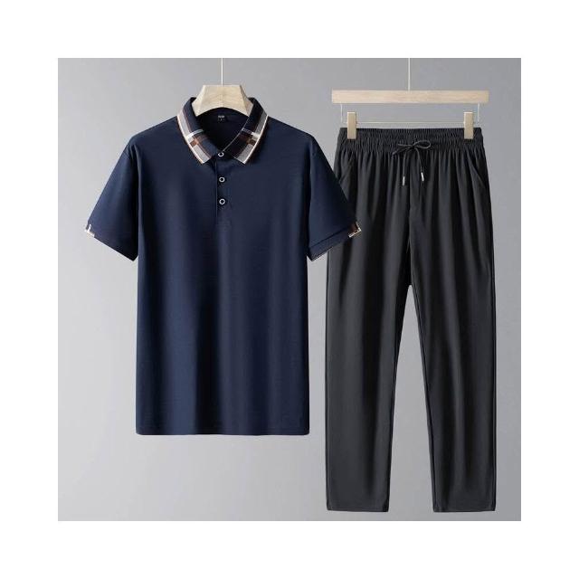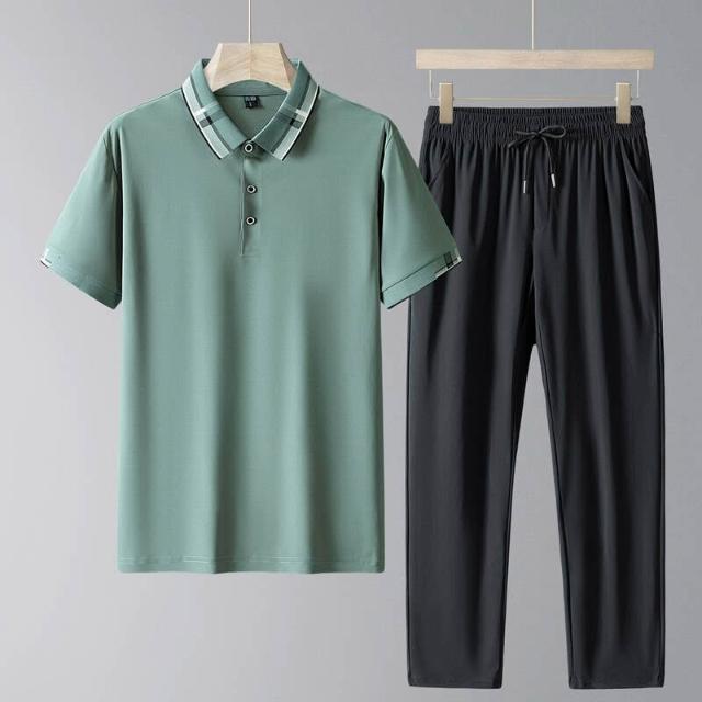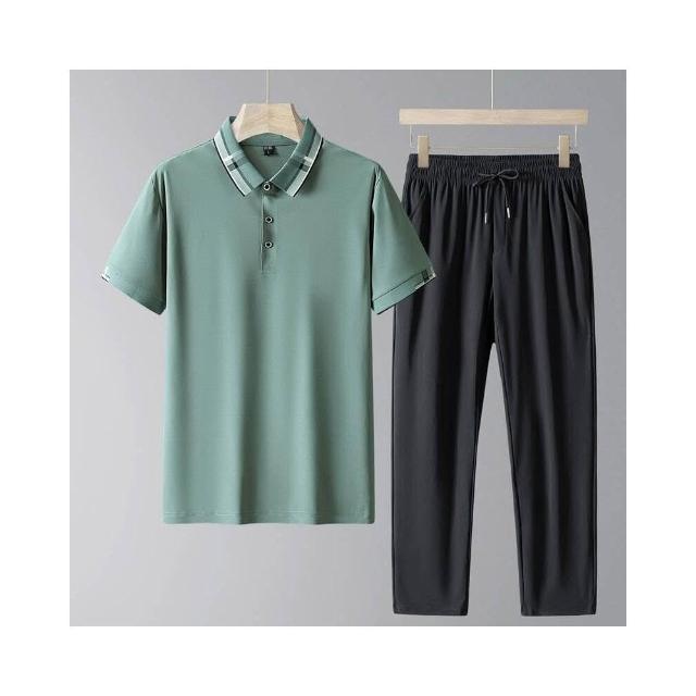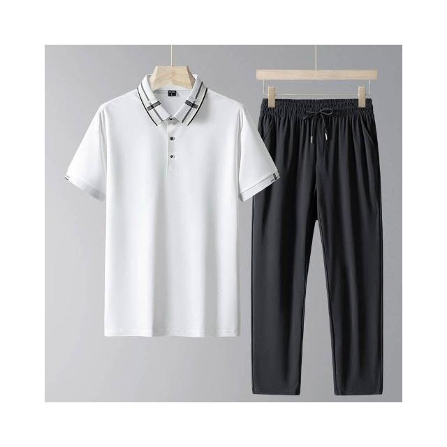 運動套裝男polo衫短袖上衣大尺碼涼感衣長褲吸濕排汗衣薄冰絲短袖T恤褲子休閒套裝男生羽球衣服高爾夫球衣登山透氣速乾褲子 居家舒適套裝夏天運動寬長褲兩件式套裝寬鬆t恤中年爸爸男裝兩件套防曬褲跑步健身衣