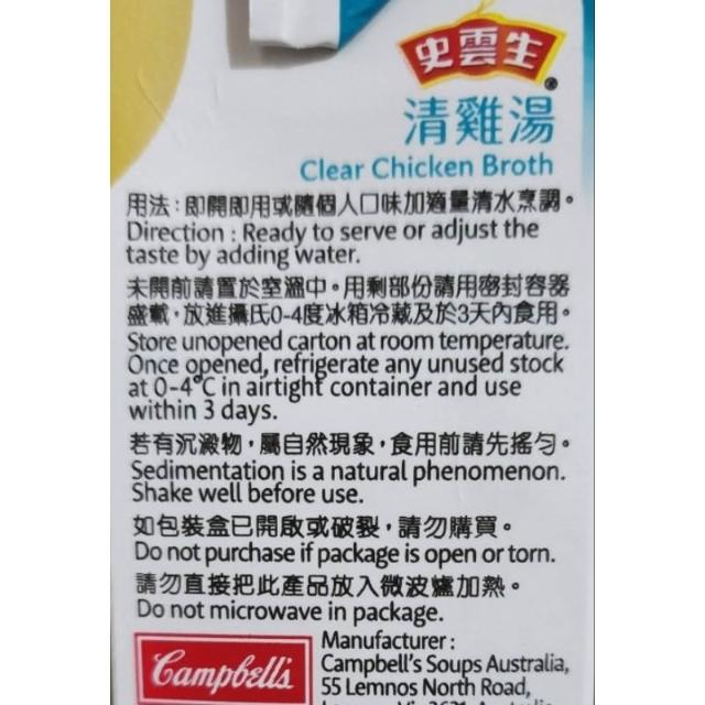 史雲生 清雞湯 500ml 無味精 無防腐劑 無人工香料 澳洲 金寶 火鍋 湯底 煮麵 稀飯 雞湯 高湯
