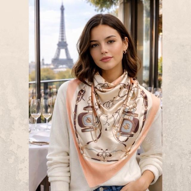 Awayuki日本製 絲巾_維斯特洛 馬具圖騰絲巾-淡橘(90x90cm) 純絲 絲巾 90*90 日本絲巾 大方巾 9090