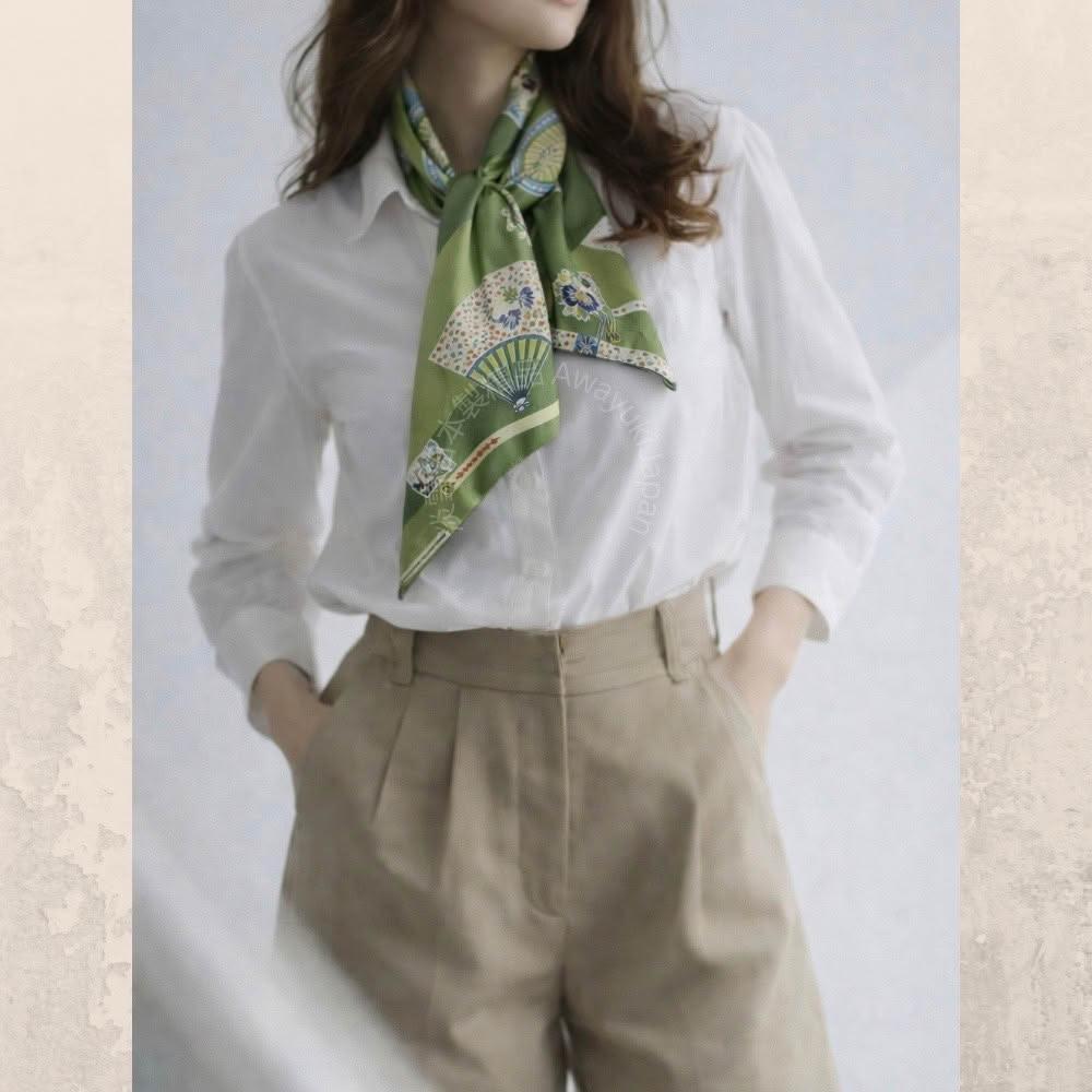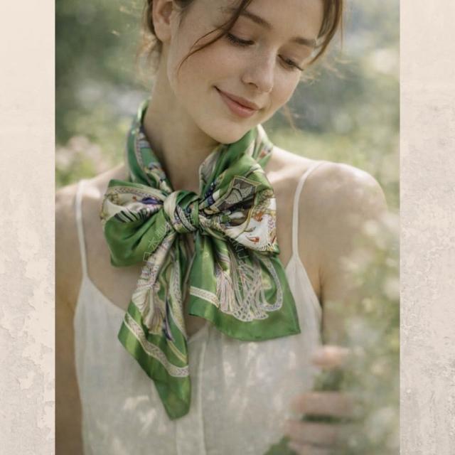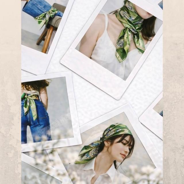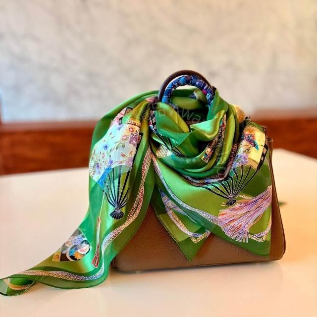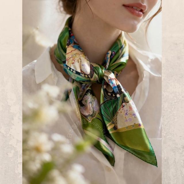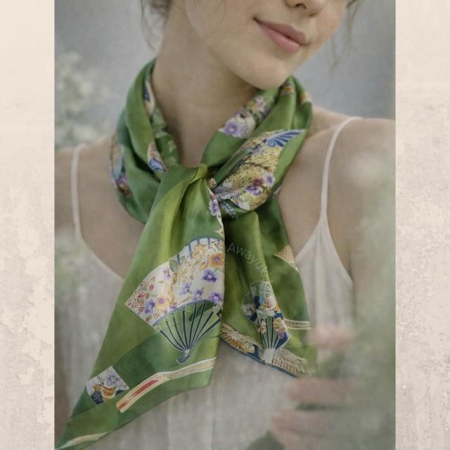 Awayuki日本製 絲巾_花扇翠影-翠綠色(88 × 88cm) 絲巾 方形絲巾 大方巾 日本絲巾 9090 披肩 冷氣房 日夜溫差