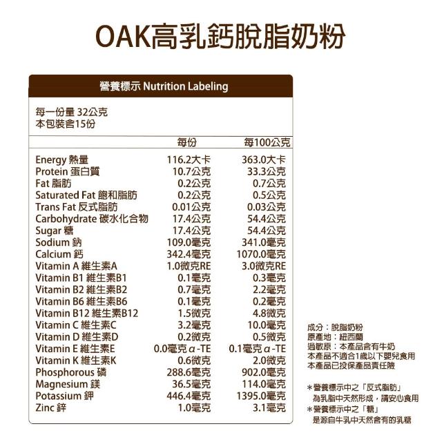 OAK 澳愛開 快溶特級全脂奶粉 高乳鈣脫脂奶粉 500g/袋