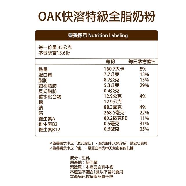 OAK 澳愛開 快溶特級全脂奶粉 高乳鈣脫脂奶粉 500g/袋