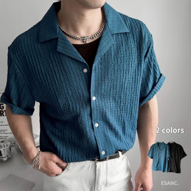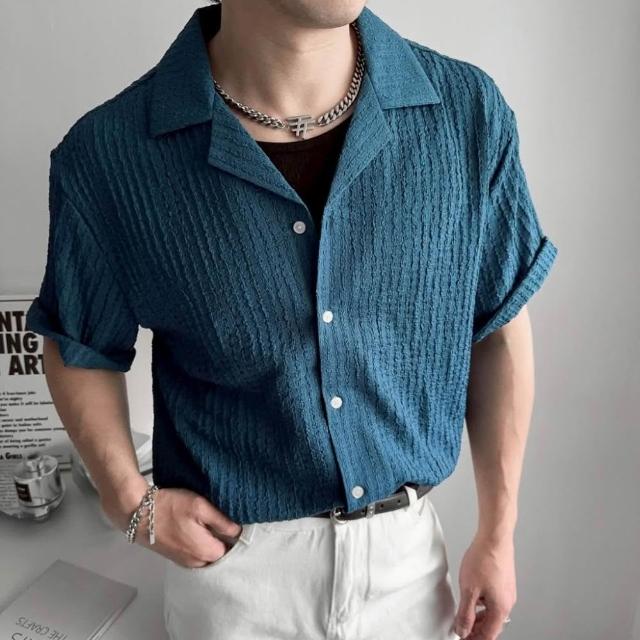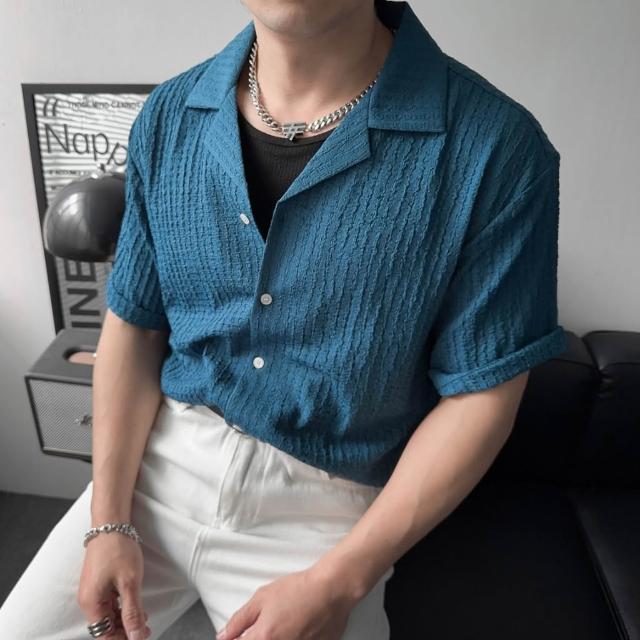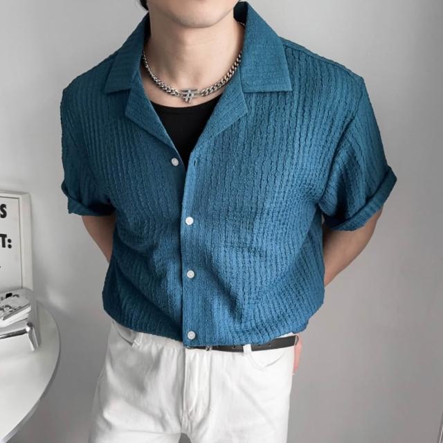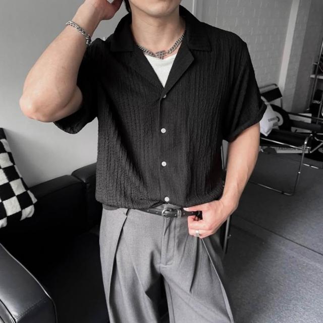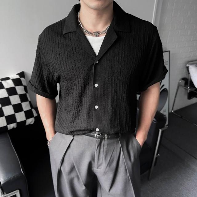 衣衫倉庫 韓國 素面襯衫 古巴領 2色 立體坑條 短袖襯衫男