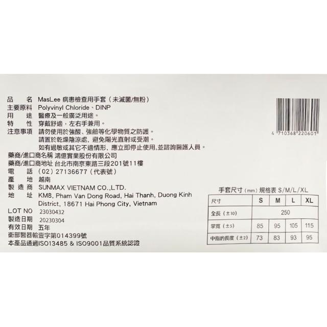 MasLee 無粉塑膠檢診手套| PVC手套 半透明手套 檢診手套 100入/盒