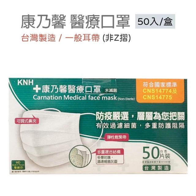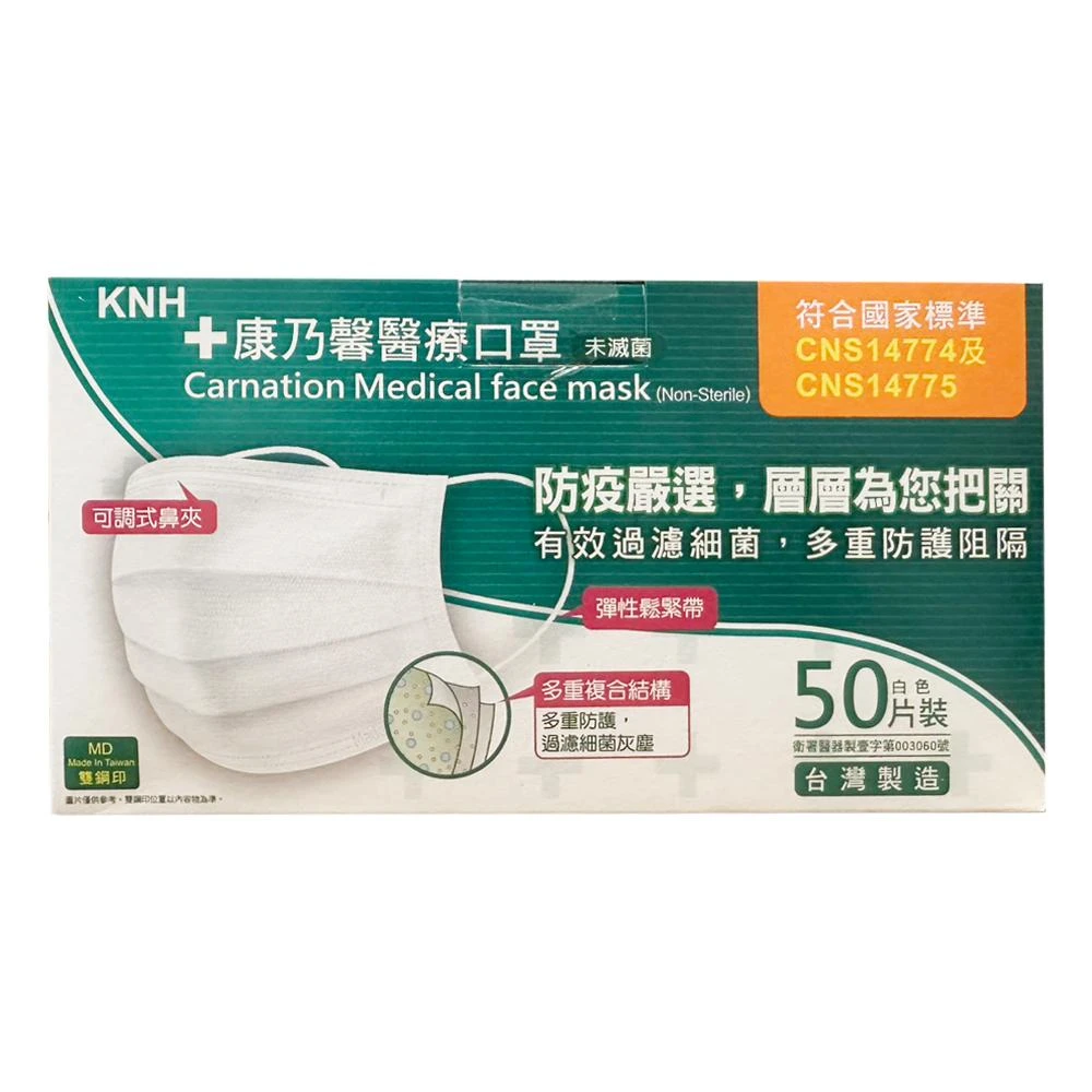 康乃馨KNH 康乃馨口罩 (未滅菌) 台灣製造 雙鋼印 50片/盒【白色】178mm X 95mm