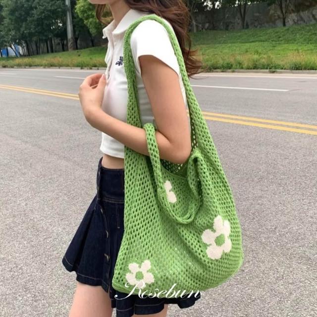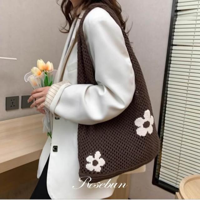 𝑹𝒐𝒔𝒆𝒃𝒖𝒏. 夏日花朵刺繡針織包 編織肩背包 手提包 韓國包包 韓網包 大容量包 海灘包 韓網包