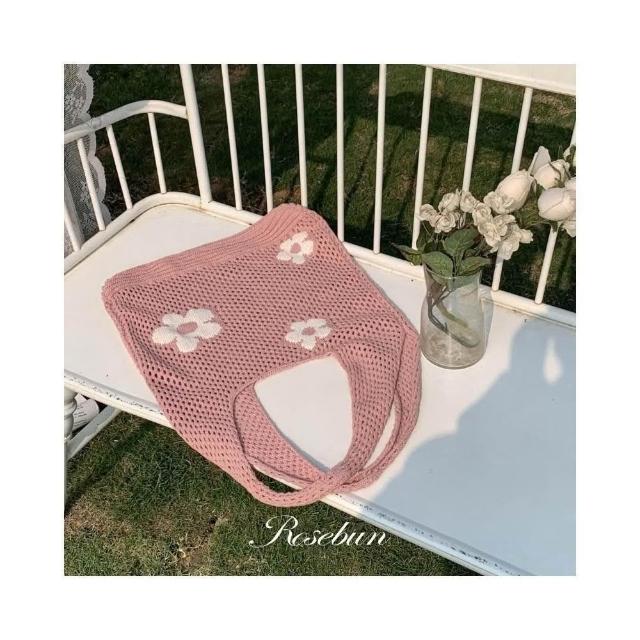 𝑹𝒐𝒔𝒆𝒃𝒖𝒏. 夏日花朵刺繡針織包 編織肩背包 手提包 韓國包包 韓網包 大容量包 海灘包 韓網包
