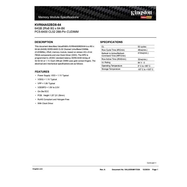 Kingston 金士頓 金士頓 Clocked CUDIMM 64G DDR5 6400 KVR64A52BD8-64 RAM 記憶體