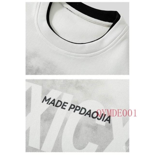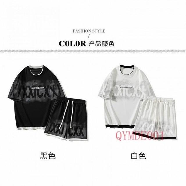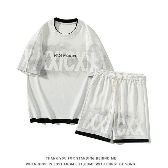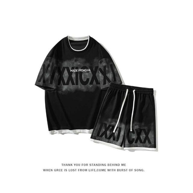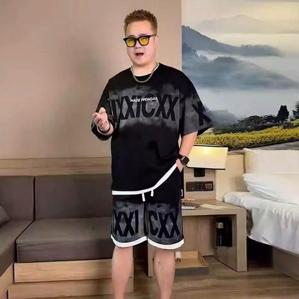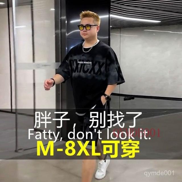 150公斤 8XL大尺碼男裝 透氣中袖T恤 運動五分褲 假兩件短袖短褲套裝男夏季潮牌字母T恤男裝一套搭配帥氣休閒衣服