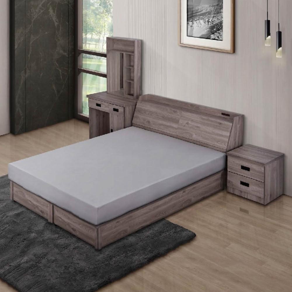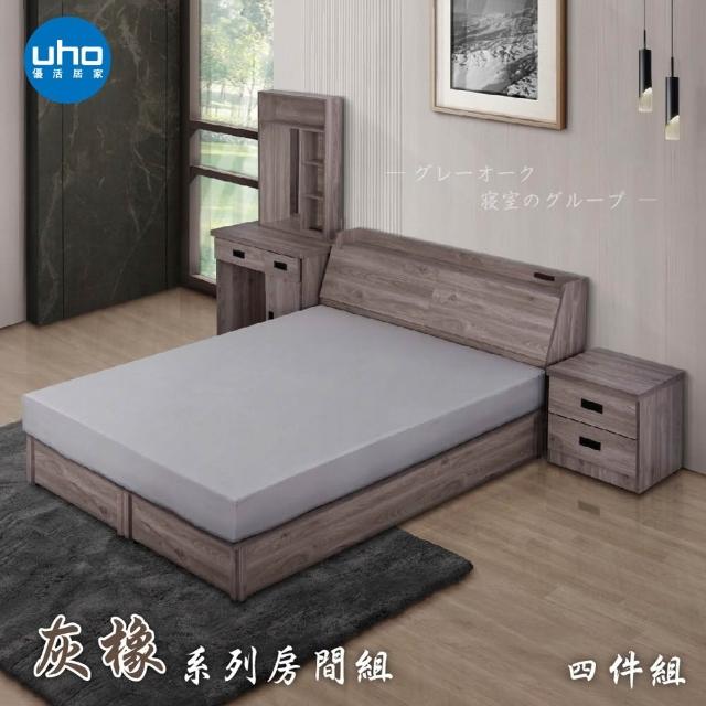 UHO台灣製 灰橡色-木心板4件床組/房間組(床頭箱+加強床底+床邊櫃+化妝台) 5尺雙人/6尺雙人加大