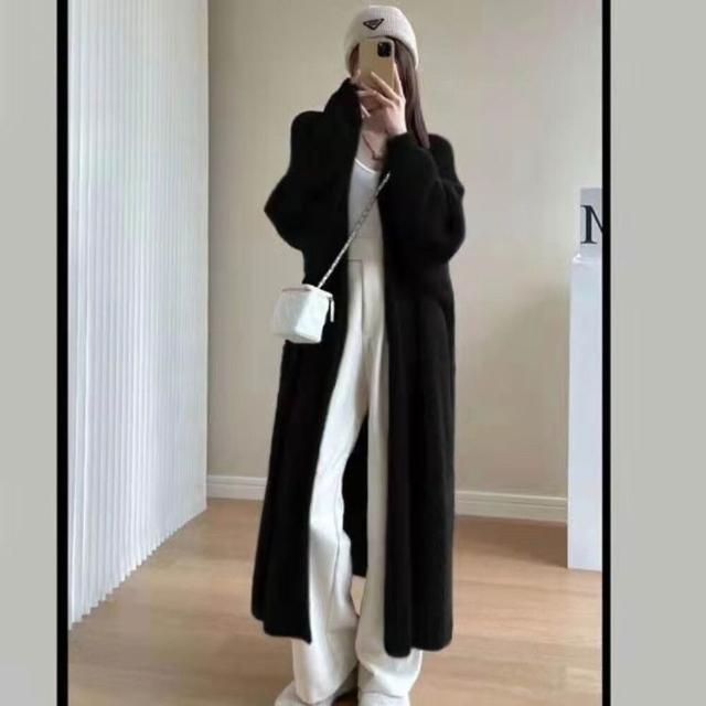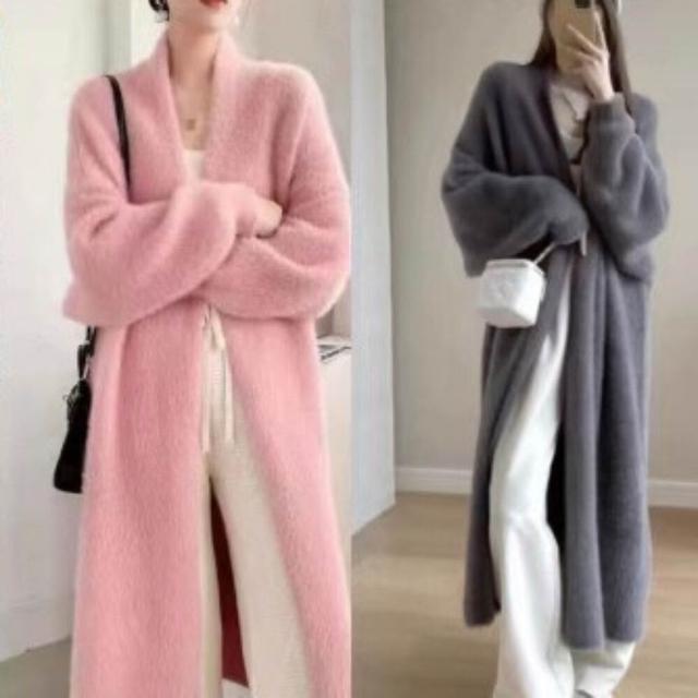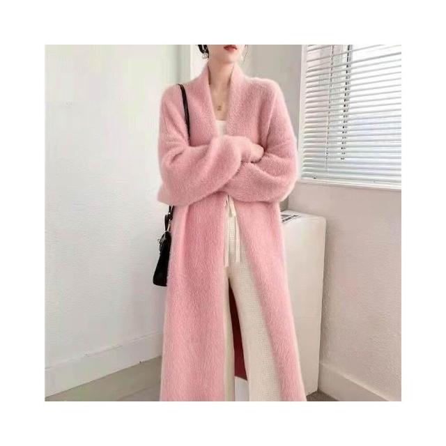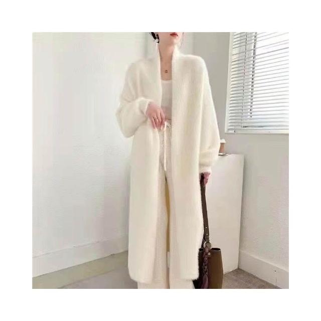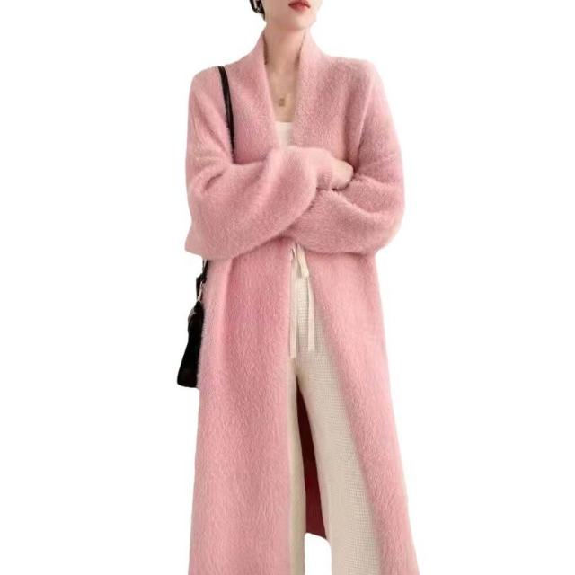 針織衫女仿水貂絨氣質長版過膝毛衣開衫女秋冬新款慵懶風寬松加厚針織外套舒適休閒純色女裝拉毛名媛風上衣無領粉色白色無扣長袖