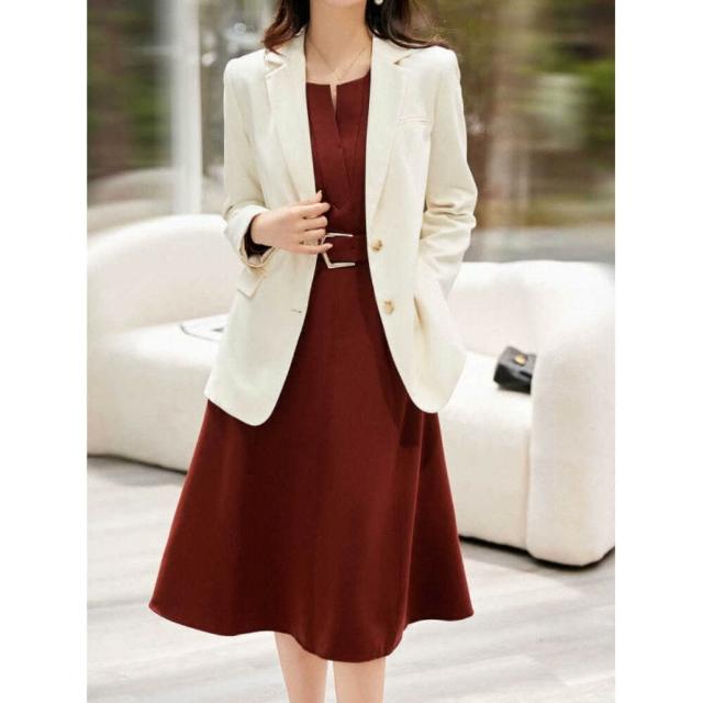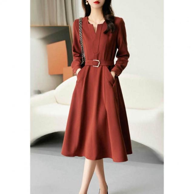 連身裙女長袖洋裝V領設計腰帶修身女裙子氣質連衣裙2025年春秋季小個子時尚百搭法式橘紅色長裙街頭風純色A字裙黑色中長裙